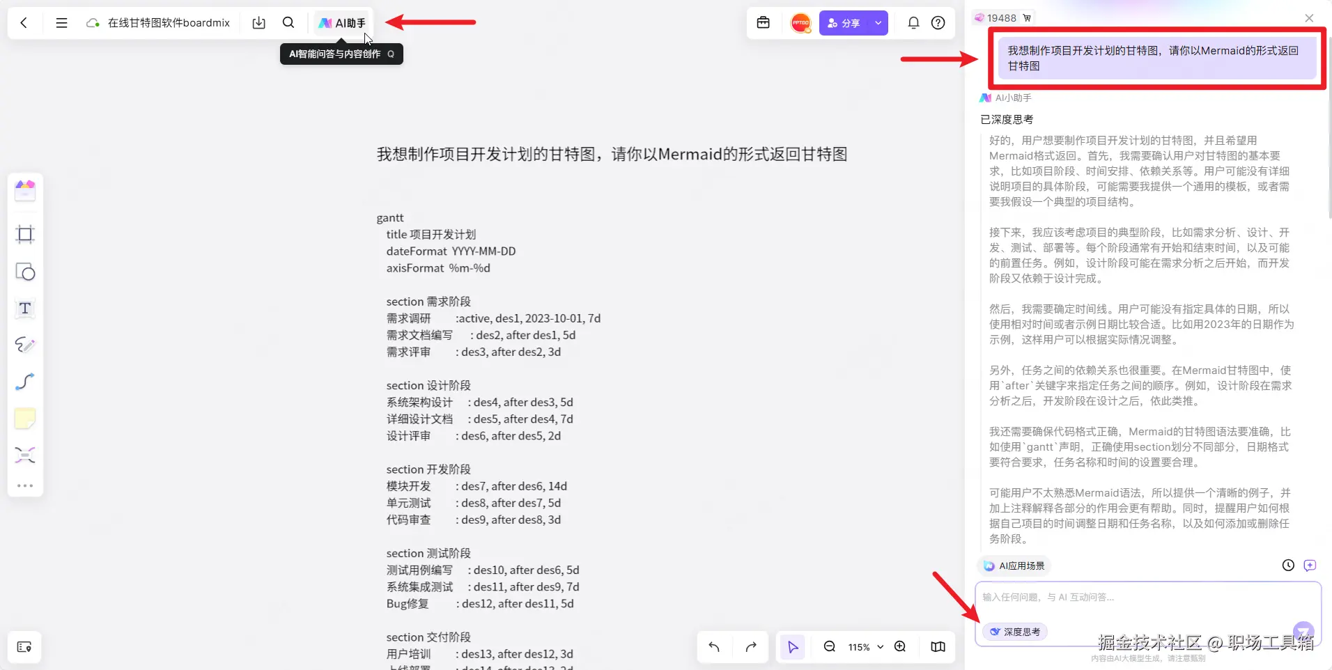 在打开的boardmix白板中,点击左上角的“AI助手”,打开右侧的AI助手面板,点击底部输入框左下角的“深度思考”,启用DeepSeek R1满血版,在输入框输入想制作的甘特图名称,让DeepSeek以Mermaid代码的形式返回甘特图。