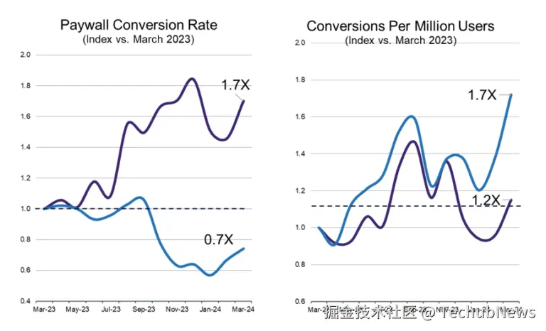 那么如果取消付费墙,能够实现媒体和用户双赢吗?付费墙策略对媒体的经营又会有多大影响呢?媒体数据分析公司 Mather Economics 发布了一篇报告《「封闭式」和「开放式」新闻网站的付费墙拦截率带来收入优化洞察》,该报告分析了 118 个新闻媒体网站在 2023 年 3 月改变付费墙策略后一年的表现。研究变量包括每月用户数、每月页面浏览量、每百万用户的转化率以及付费墙转化率。最后通过经济模型来查看他们的付费墙策略如何影响订阅量、留存率和收入。