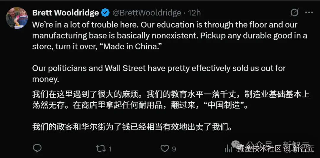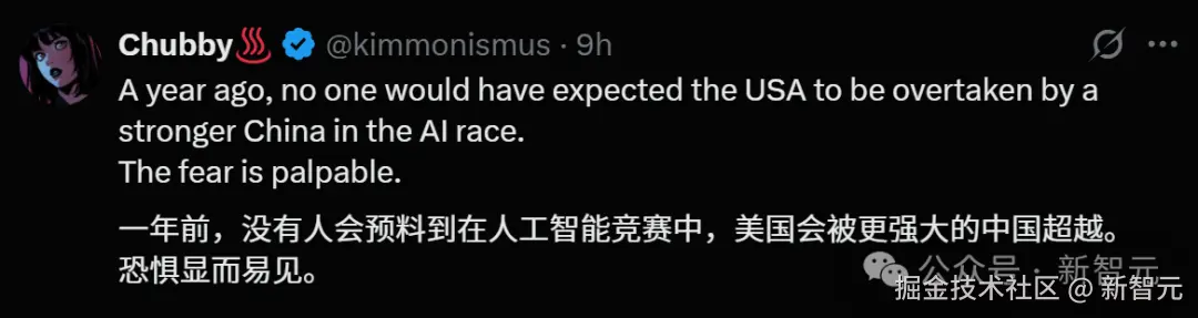 某 AI 大 V 如是说:一年前,没有人会预料到,在 AI 竞赛中,美国竟会被更强大的中国超越。如今,这种恐慌已经弥漫开来,更加显而易见。