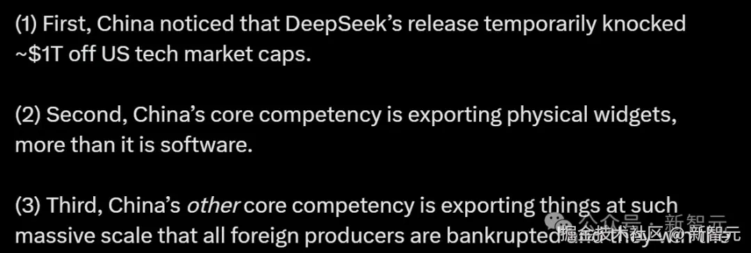 - 中国注意到,DeepSeek 的发布曾一度让美国科技公司的市值蒸发了大约一万亿美元。