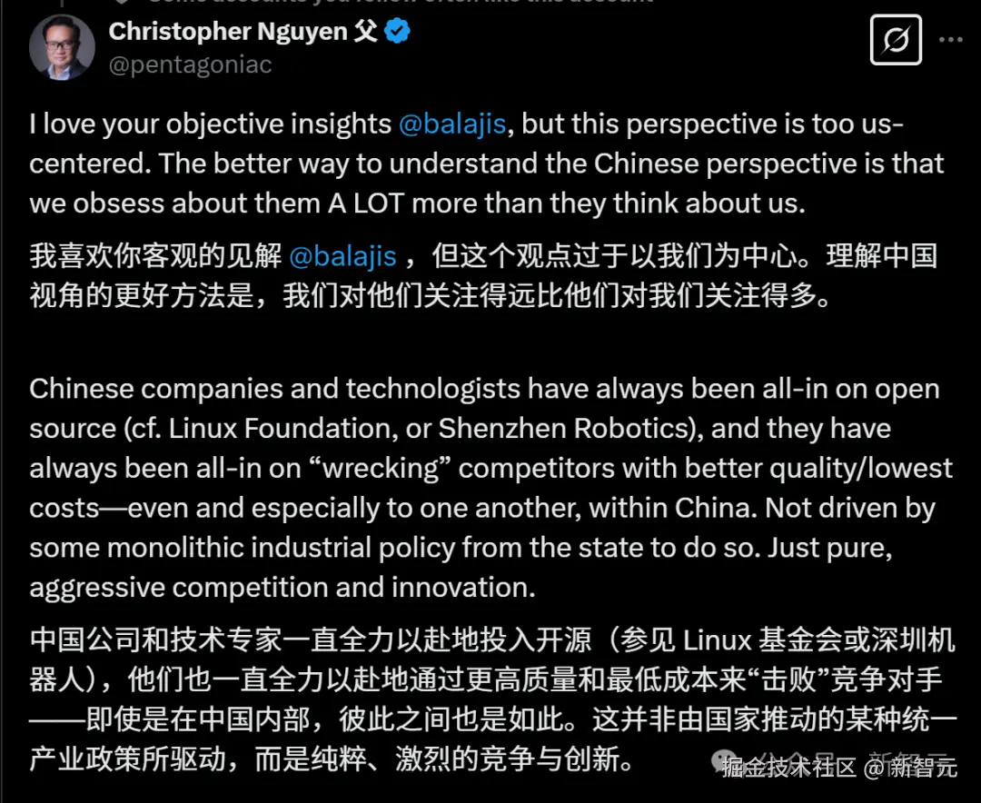 Aitomatic CEO、港科大教授 Christopher Nguyen 对此评价道:你的很多客观见解都很有道理,但我认为你的观点太过「美国中心主义」了。