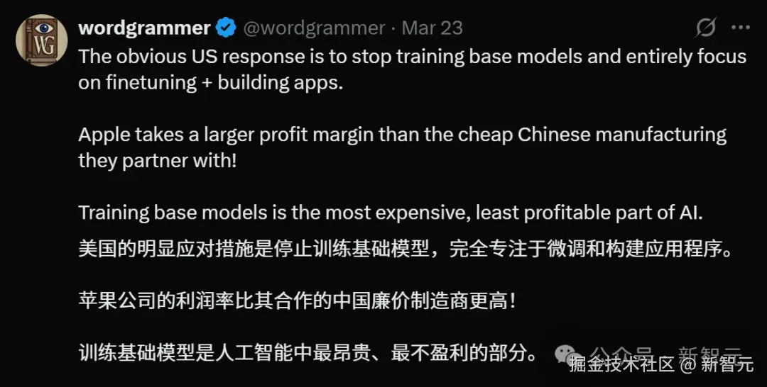 有人表示,所以美国现在的对策就是停止训练基础模型,完全专注于微调和构建 app。训练基础模型,已经是整个 AI 产业中最昂贵、利润最低的部分,所以最不划算。
