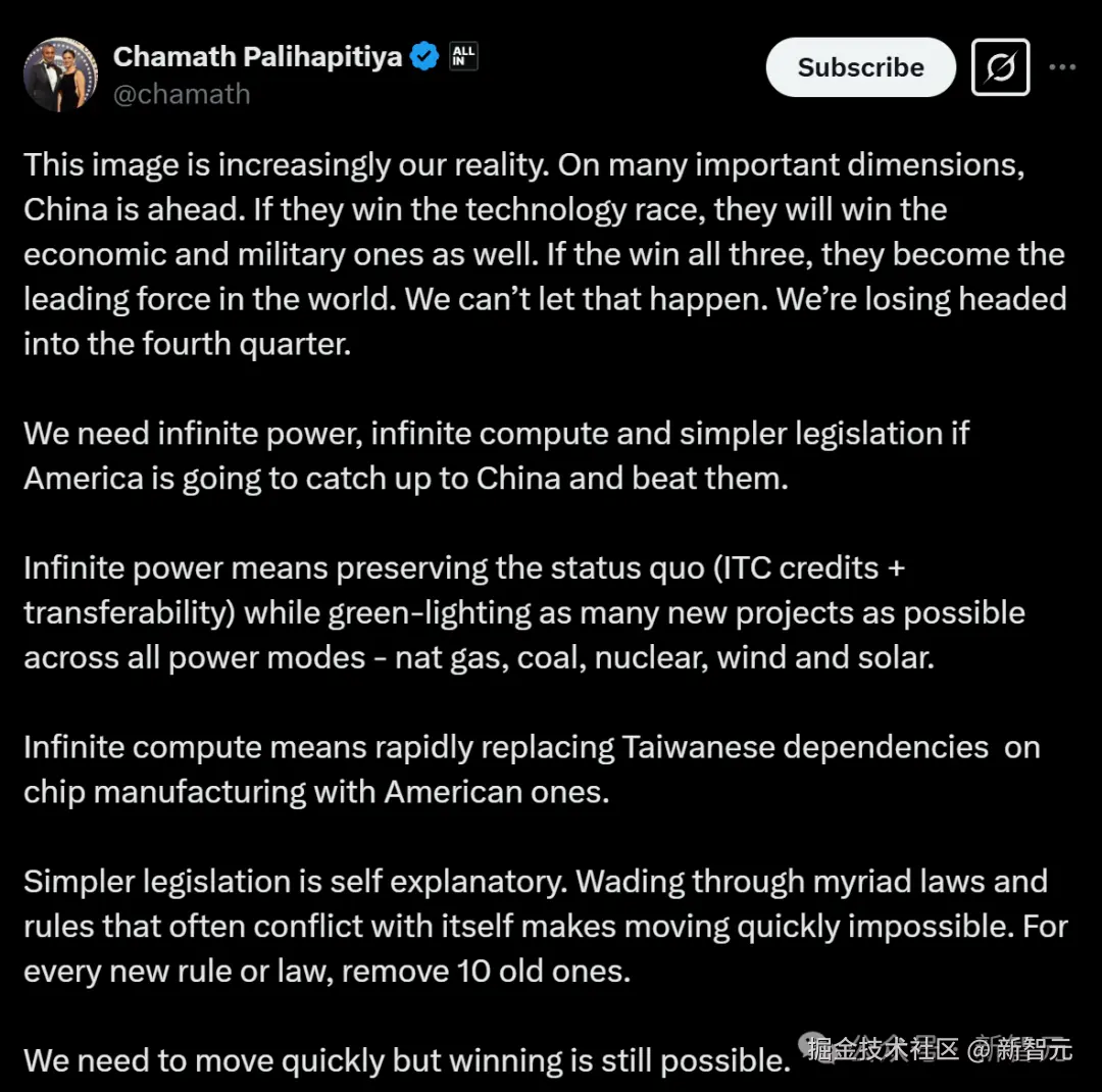 因此,如果美国现在还想赶上中国、击败他们,就需要无限的能源、无限的算力和更简单的立法。