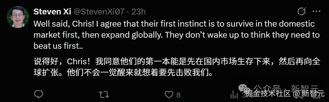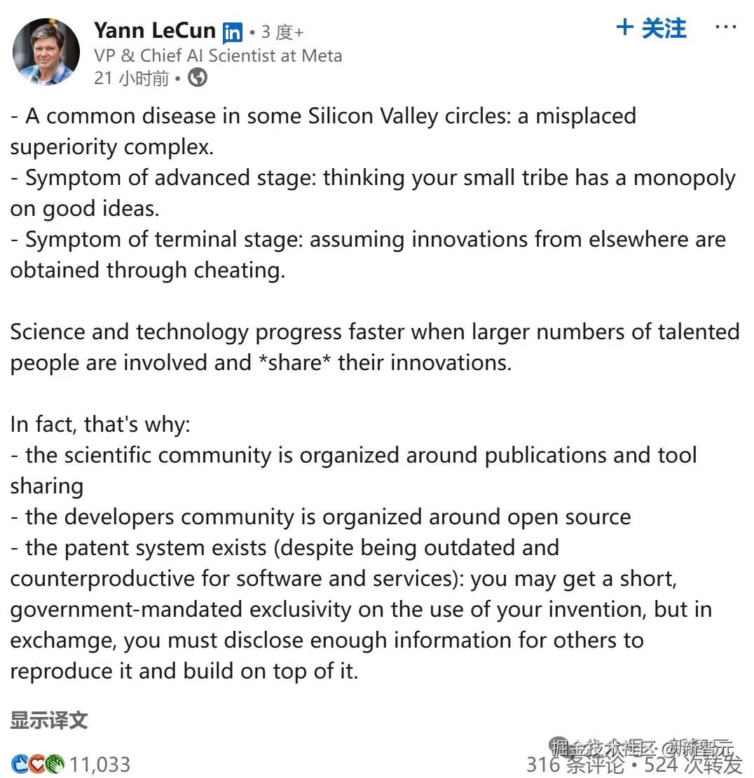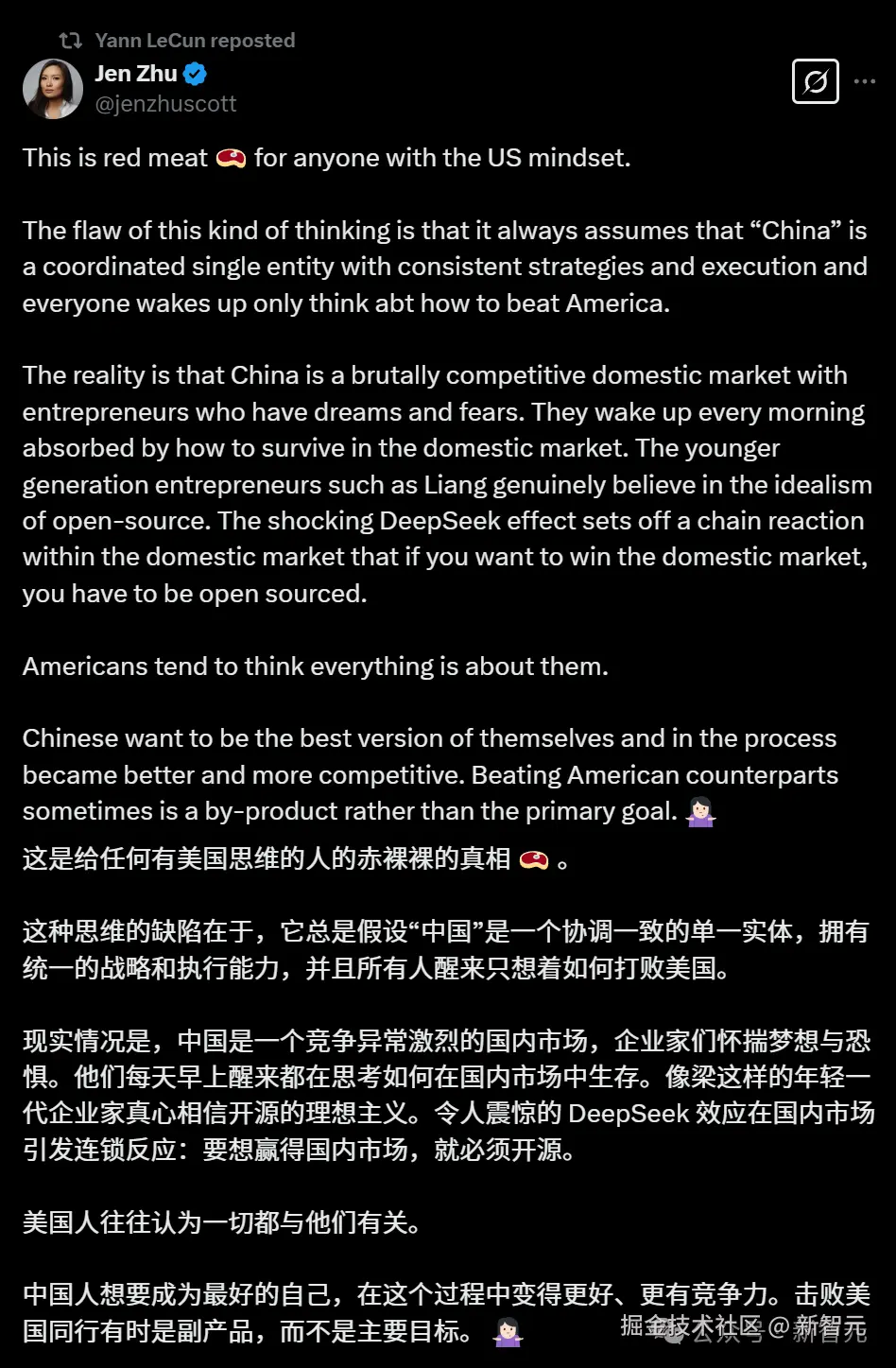 并且这次,LeCun 依然转发了类似论调的观点,强调中国并不是一个协调一致的单一实体,而是一个竞争异常激烈的国内市场,企业家们时刻怀揣着梦想,也怀揣着被人赶上的恐惧。