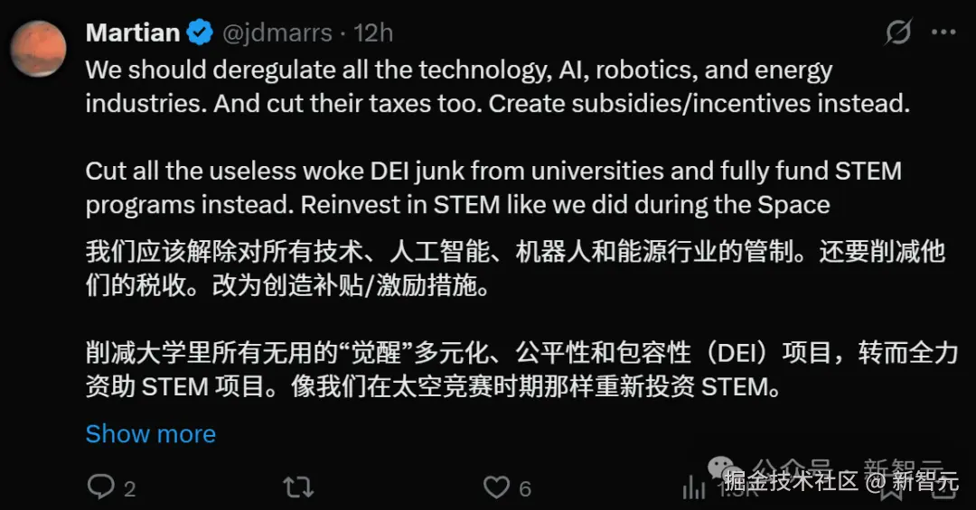 很多人呼吁,现在,美国应该解除对所有技术、AI、机器人和能源行业的管制,像在太空竞赛时那样,重新投资 STEM。
