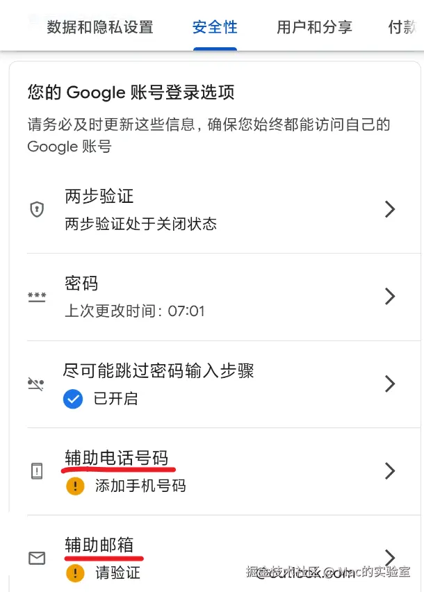 2、会把刚才用于验证的电话号码列出来,并作为辅助电话号码——实际上,并没有绑定,这是谷歌提示的一个小bug。