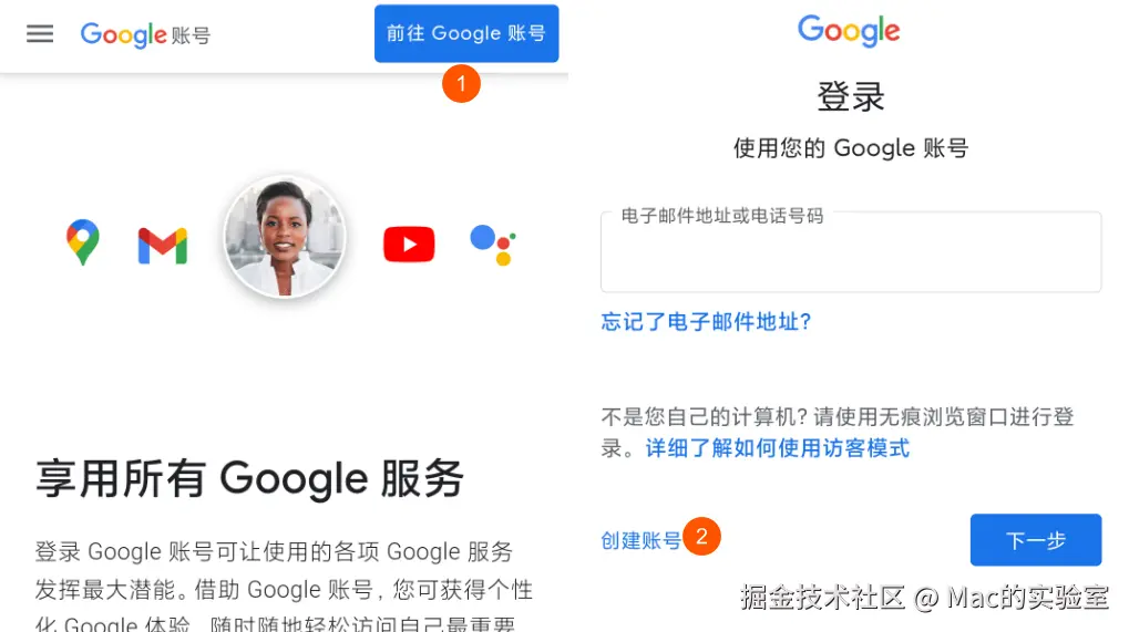 通过浏览器进入到谷歌账号管理首页,点击右上角的 前往Google账号,然后点击左下角的创建账号。(下面上图。)