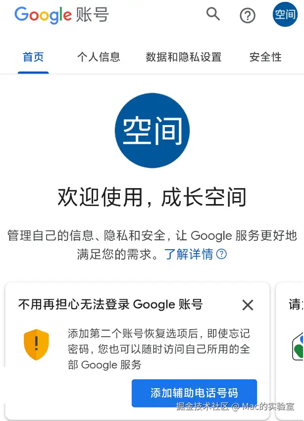 提醒:有的时候,在其他APP中注册新账号的时候不会进入到这个界面,我们可以点击右上角的头像,选择“管理您的Google账号”,即可进入到账号管理的首页。