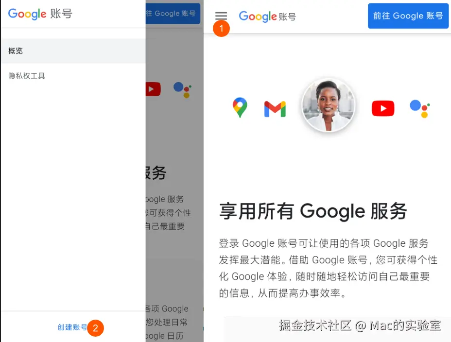 也可以在谷歌账号管理首页点击左上角三横,点击创建账号。(下面下图)。