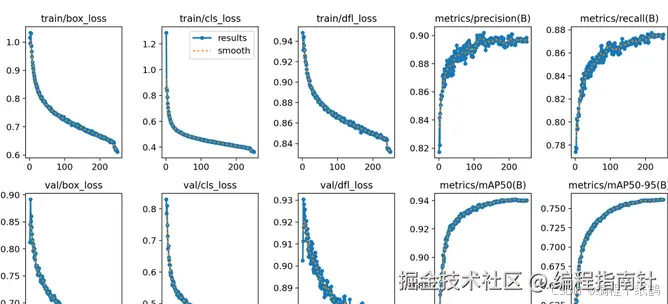 定位损失box_loss:预测框与标定框之间的误差(GIoU),越小定位得越准;分类损失cls_loss:计算锚框与对应的标定分类是否正确,越小分类得越准;动态特征损失(dfl_loss):DFLLoss是一种用于回归预测框与目标框之间距离的损失函数。在计算损失时,目标框需要缩放到特征图尺度,即除以相应的stride,并与预测的边界框计算Ciou Loss,同时与预测的anchors中心点到各边的距离计算回归DFLLoss。这个过程是YOLOv8训练流程中的一部分,通过计算DFLLoss可以更准确地调整预测框的位置,提高目标检测的准确性。本文训练结果如下: