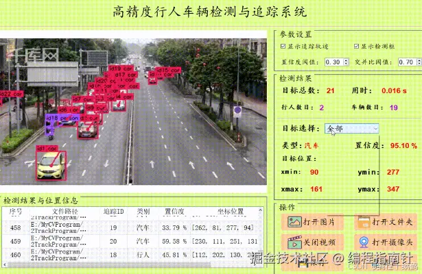 车辆行人多目标检测与追踪系统结合了先进的YOLOv8目标检测技术与ByteTrack多目标跟踪算法,能够在实时视频画面中准确地检测并跟踪行人与车辆。这一系统对于改善交通安全、提高城市监控效率以及增强公共安全管理具有显著的重要性。本文基于YOLOv8深度学习框架,通过5607张图片,训练了一个进行车辆与行人的目标检测模型,准确率高达94%;然后结合ByteTrack多目标跟踪算法,实现了目标的追踪效果。最终基于此开发了一款带UI界面的车辆行人多目标检测与追踪系统,可用于实时检测场景中的车辆与行人检测追踪,可以更加方便的进行功能展示。该系统是基于python与PyQT5开发的,支持视频以及摄像头进行多目标检测追踪,也可选择指定目标追踪,支持保存追踪结果视频。本文提供了完整的Python代码和使用教程,给感兴趣的小伙伴参考学习,完整的代码资源文件获取方式见文末。