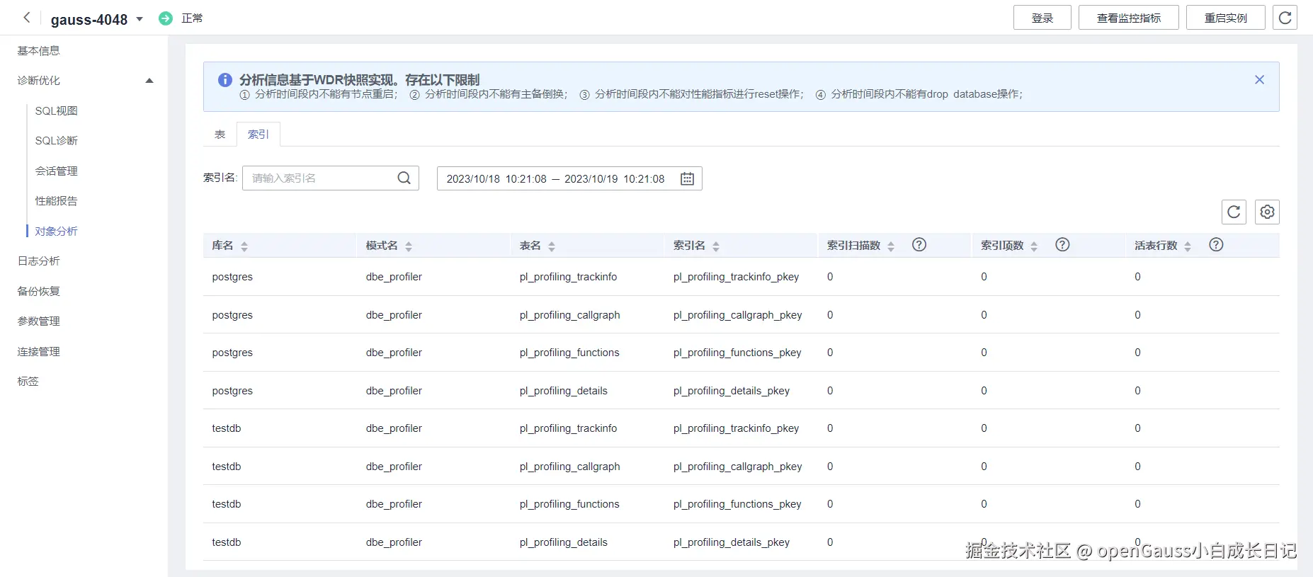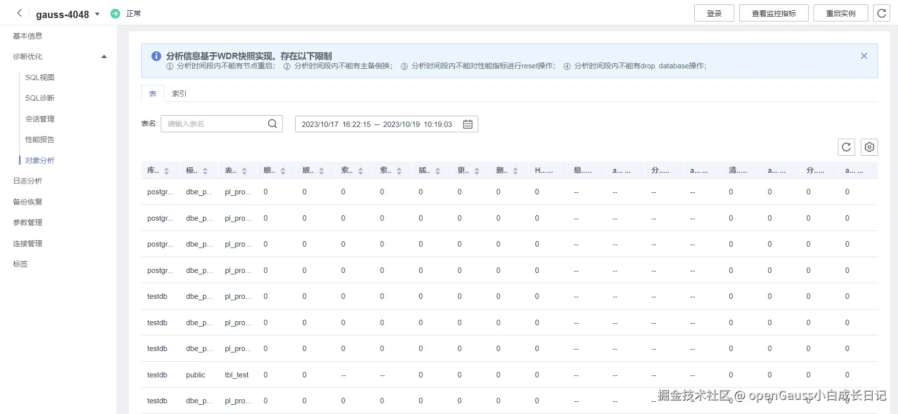 - 表分析和索引分析是分析两个时间点(两个快照)在数据库里状态对比,非实时值,该状态在比较的过程中是一个“运动值”(未落盘或者快照生效时间落后于数据更新时间等场景),可能导致部分字段出现较小误差(如插入行数、更新行数、删除行数等字段)。