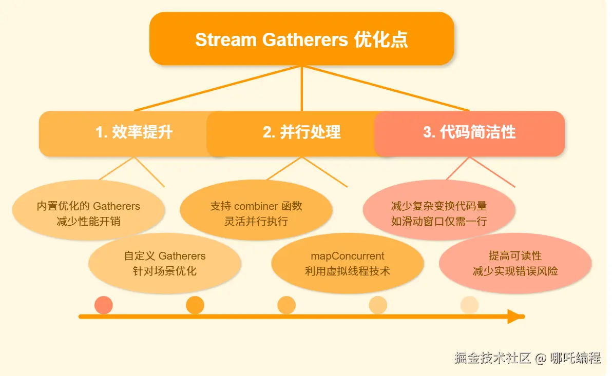 从上述对比可见,Stream Gatherers 显著简化了实现,特别适合状态依赖的操作。