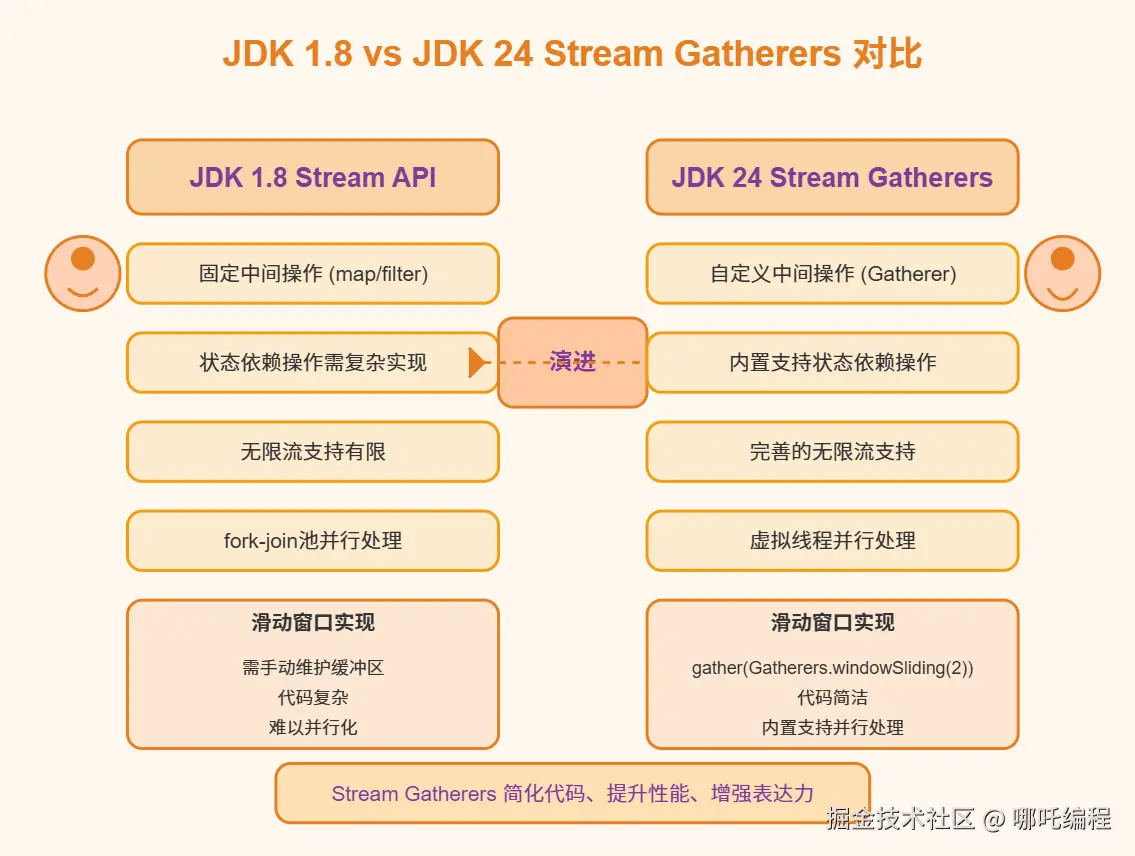 | 操作 | JDK 1.8 实现 | Stream Gatherers (JDK 24) | 优势 |