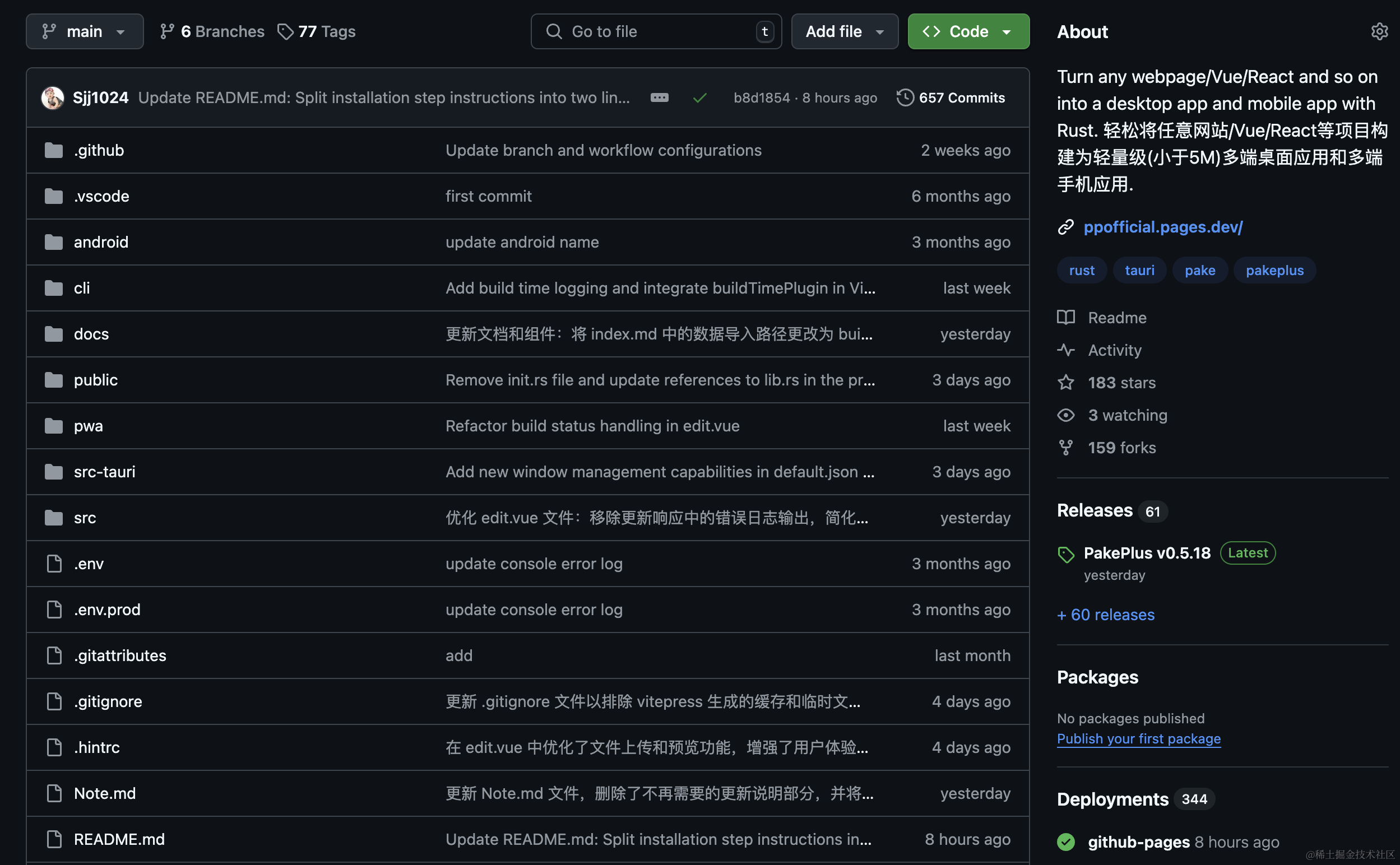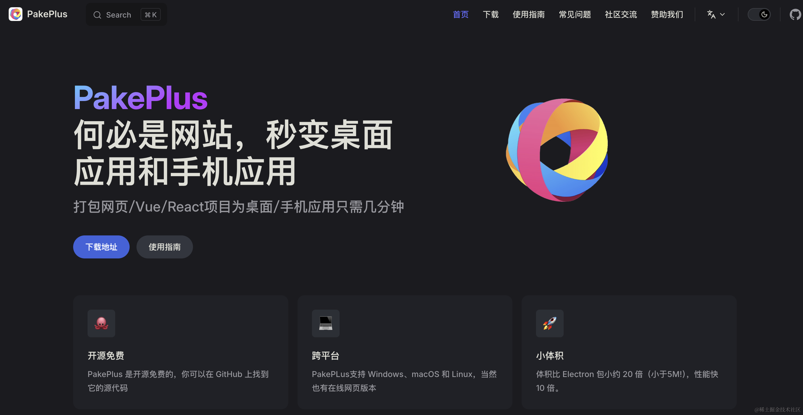 PakePlus 是一个基于 Tauri2 和 Github 的开源打包工具,无需在本地安装复杂的 rust 和 node 依赖环境,只需要一个 Github Token 就可以将任意网站/Vue/React 等项目的 dist 静态文件打包为跨平台桌面软件,体积小巧(小于 5M)并且性能还高,而且 PakePlus 本身也才仅仅 8M 左右小大。