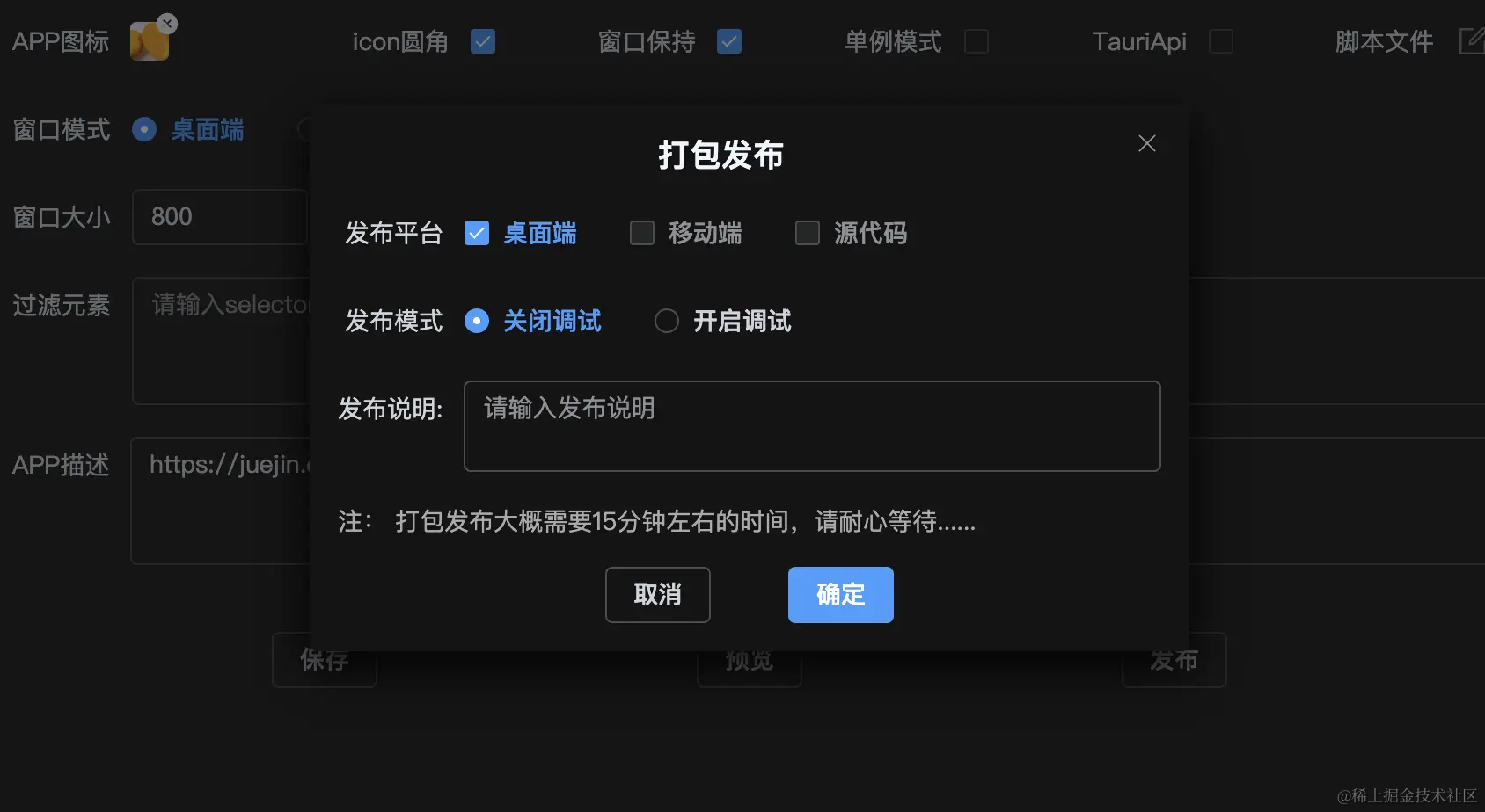 这一步就是通知 github 将你的项目编译成跨平台的桌面软件。PakePlus 暂时只支持桌面端,所以这里只需要选择桌面端即可,移动端也会很快支持。发布模式可以选择关闭调试和开启调试,开启后,当软件启动时有问题可以在控制台看到错误信息。发布说明可以添加这次发布主要是哪些内容,可以忽略。一切配置完成后,点击确定,就可以开始打包了。需要耐心等待 10 分钟左右...