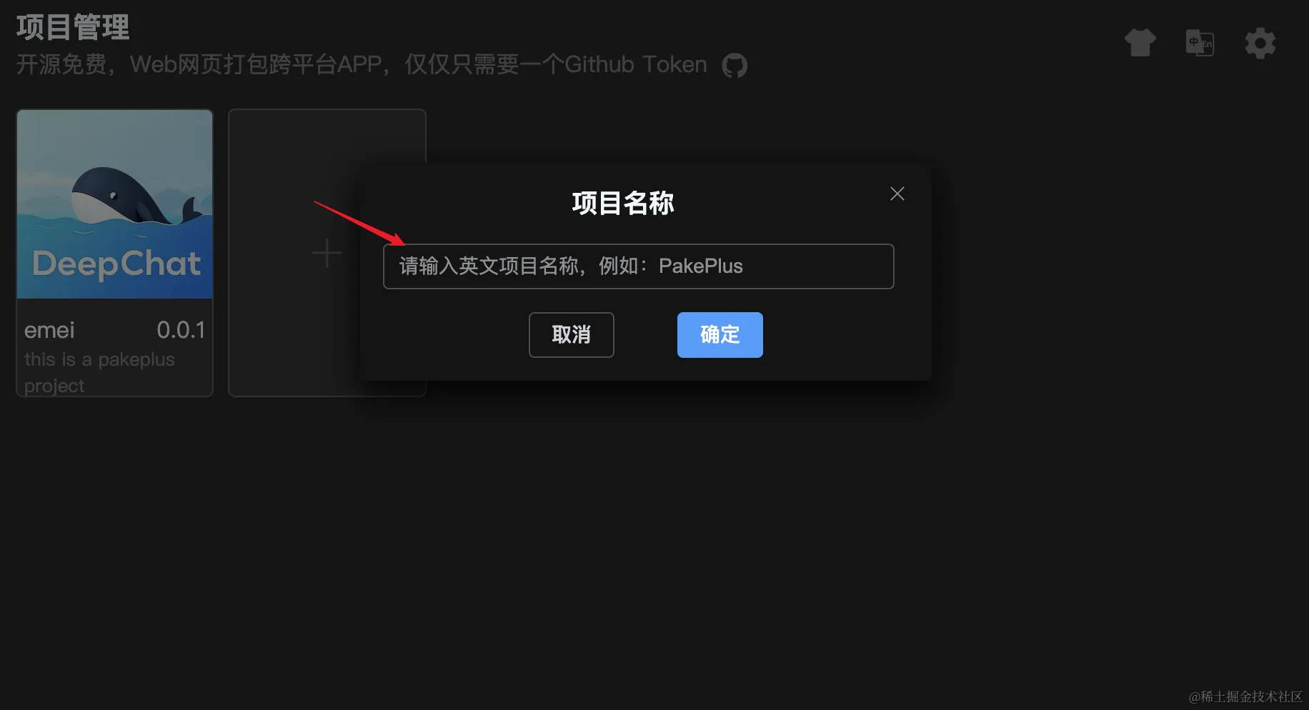 1.打开 PakePlus 首页,点击 + 按钮,创建项目。