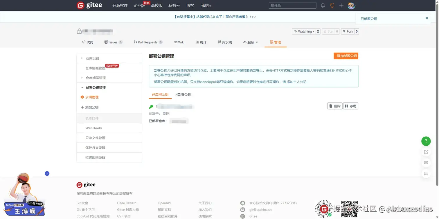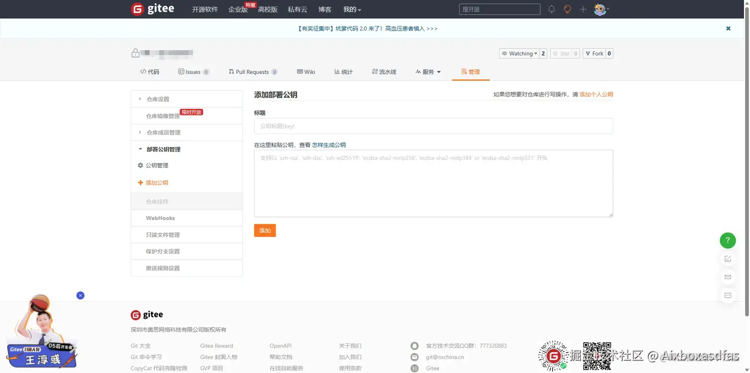 首先进入你的仓库,然后点击管理->公钥管理->添加公钥 把刚刚的公钥配置进去 ps:标题默认是你密钥的邮箱,可以自定义