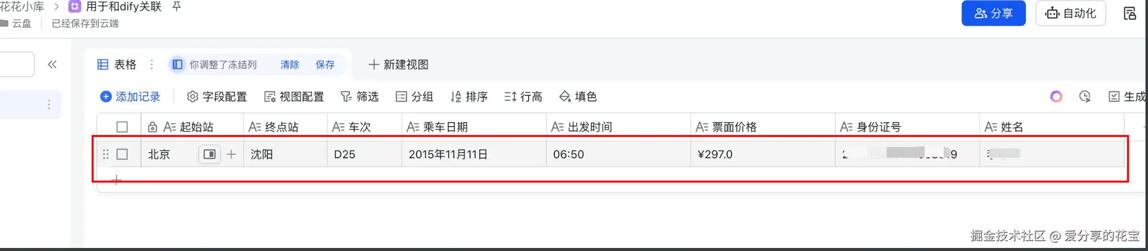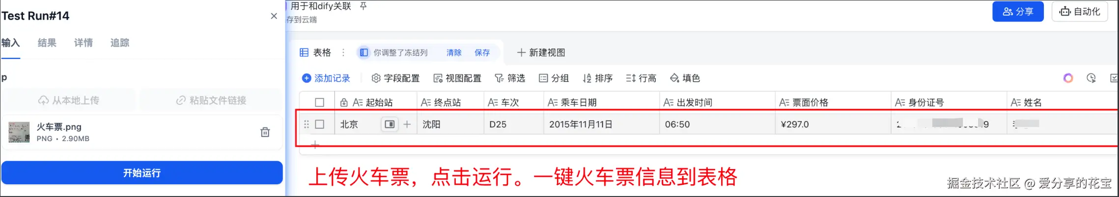 识别火车票,直接把信息录入:表格。一步到位。