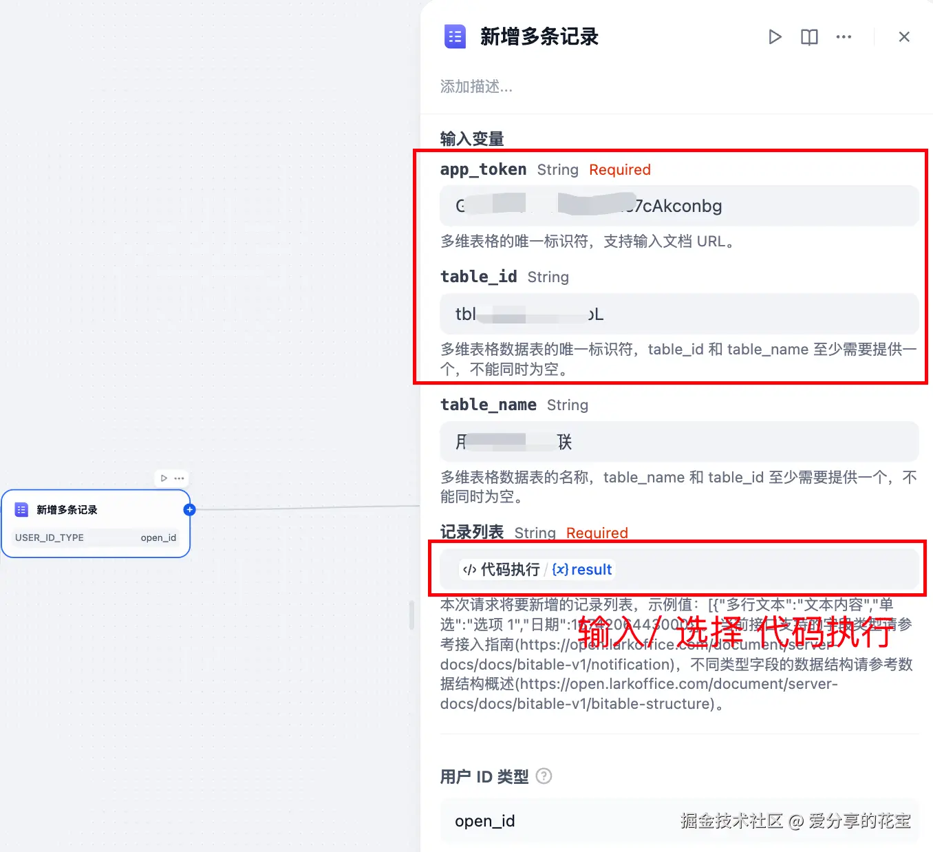 app_token:就是多维表格链接 url。table_id或者table_name:想要使用的数据表的 id。记录列表:要记录进表格中的内容,是一个列表结构。