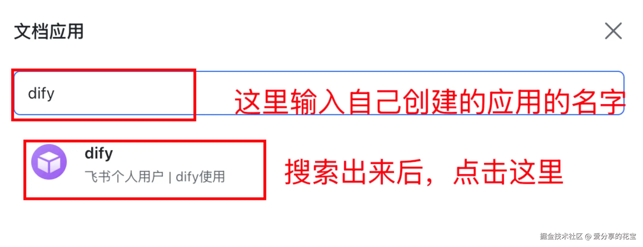 在搜索框中输入: 1.2 中创建的应用名称。搜索展示出来应用。然后点击应用。