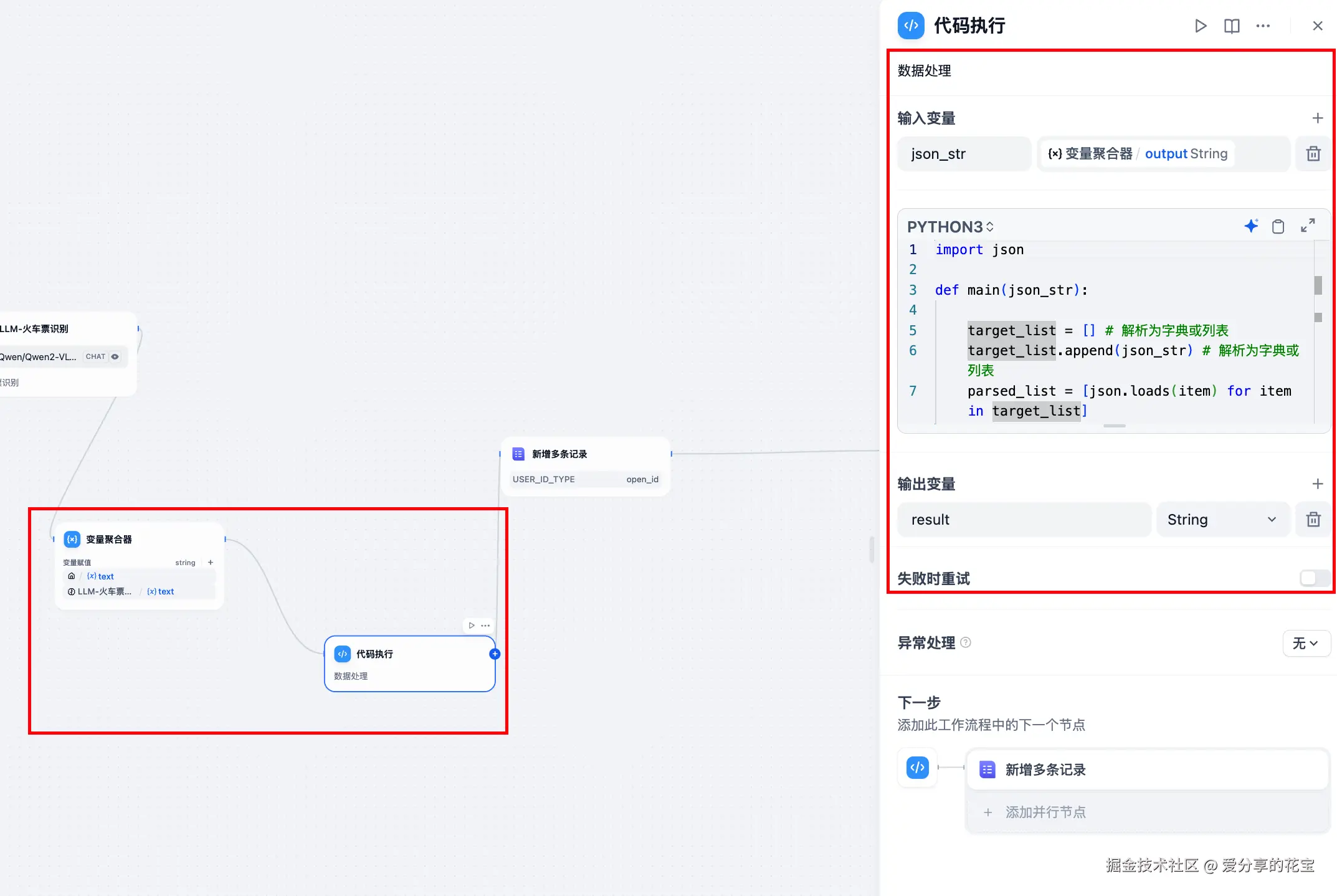 2.2 新增节点【新增多条记录】,在代码执行节点之后: