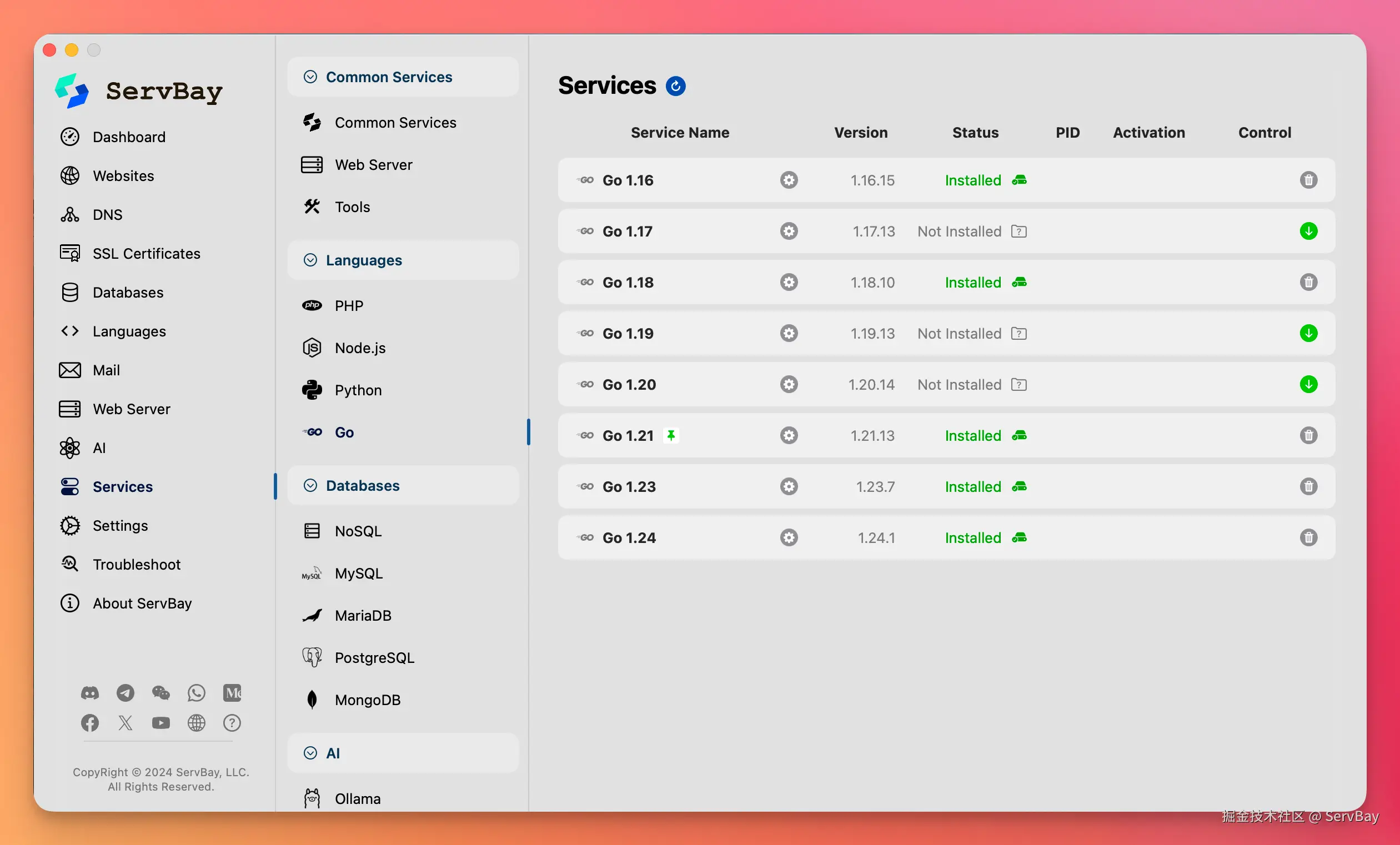 作为持续领跑开发环境管理领域的创新平台,ServBay再次迎来里程碑式更新。该版本聚焦多语言环境协同开发与跨架构 兼容性 突破,新增Go语言支持、Web服务智能调度等核心功能。