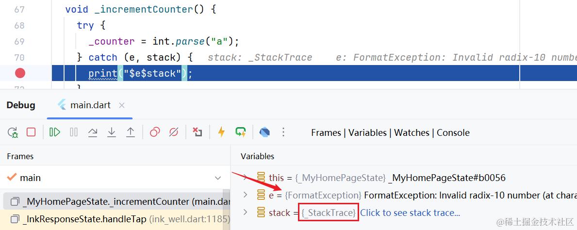 可以使用调试来查看一下这个 stack 的运行时类型。如下所示,类型为 _StackTrace :