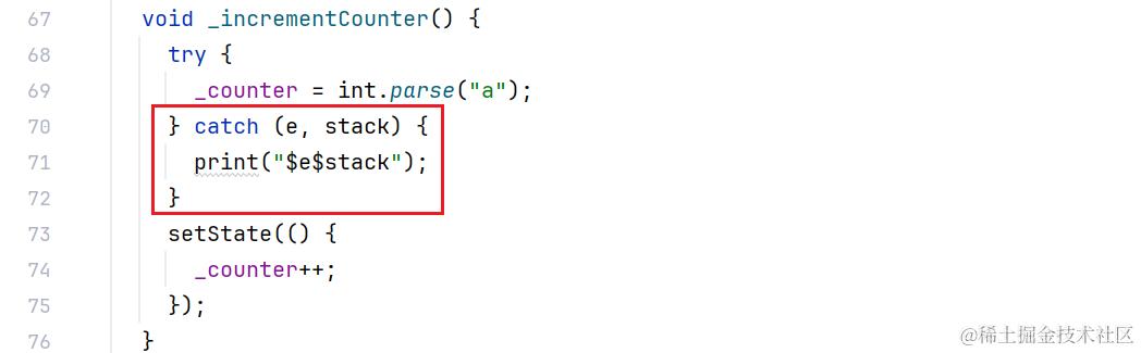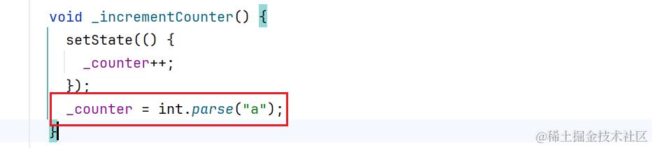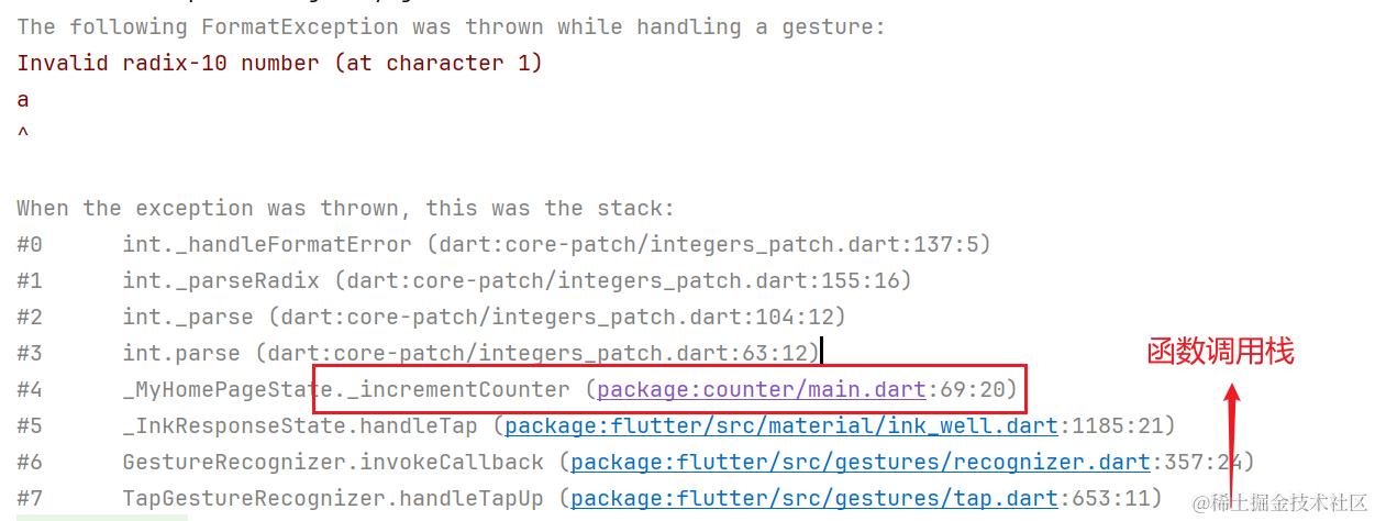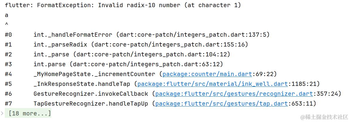 比如这里是初始的计数器项目,我在 _incrementCounter 方法开始时写了一行异常的代码。这样在运行时点击加号按钮触发方法,就会出现如上的异常信息。