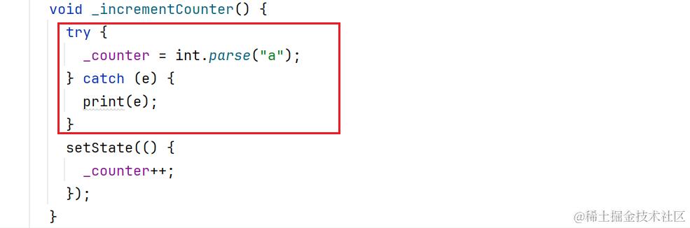 也就是说,此时点击按钮,由于下面的 setState 没有触发,界面上的数值不会变化。但如果把这行异常的语句放在后面,虽然会报错,但不会影响计数器的功能: