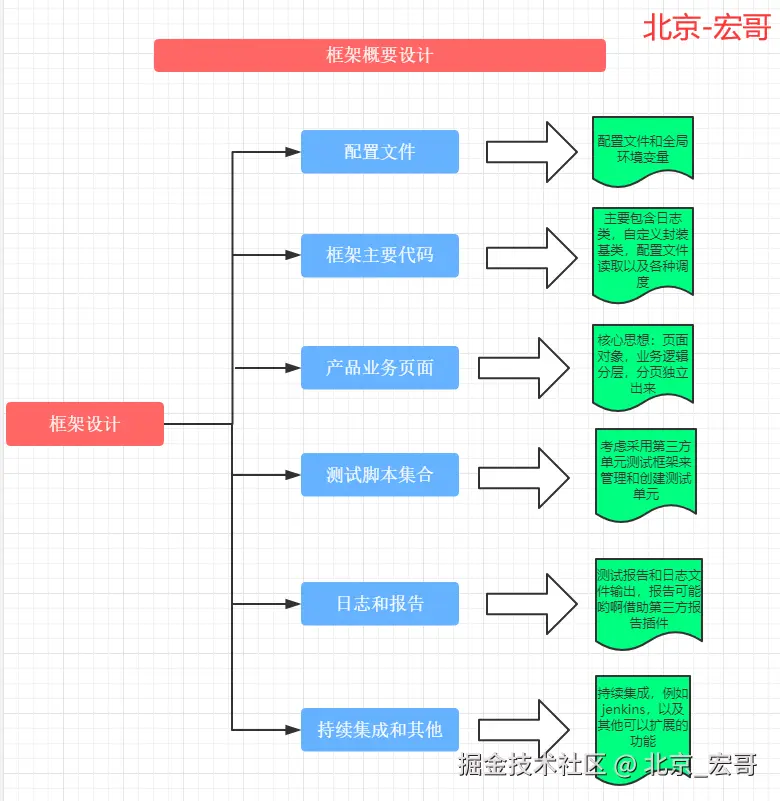 根据以上的框架概念设计的特点介绍,宏哥这里详细地用以下图来描述一下,一个简单而又实用的自动化测试框架,可能包含以下这些组成部分。宏哥目前细化到这里,后期会将这个框架的代码放到github上,欢迎有兴趣和有能力的大佬给出建议或者完善这个自动化测试框架。