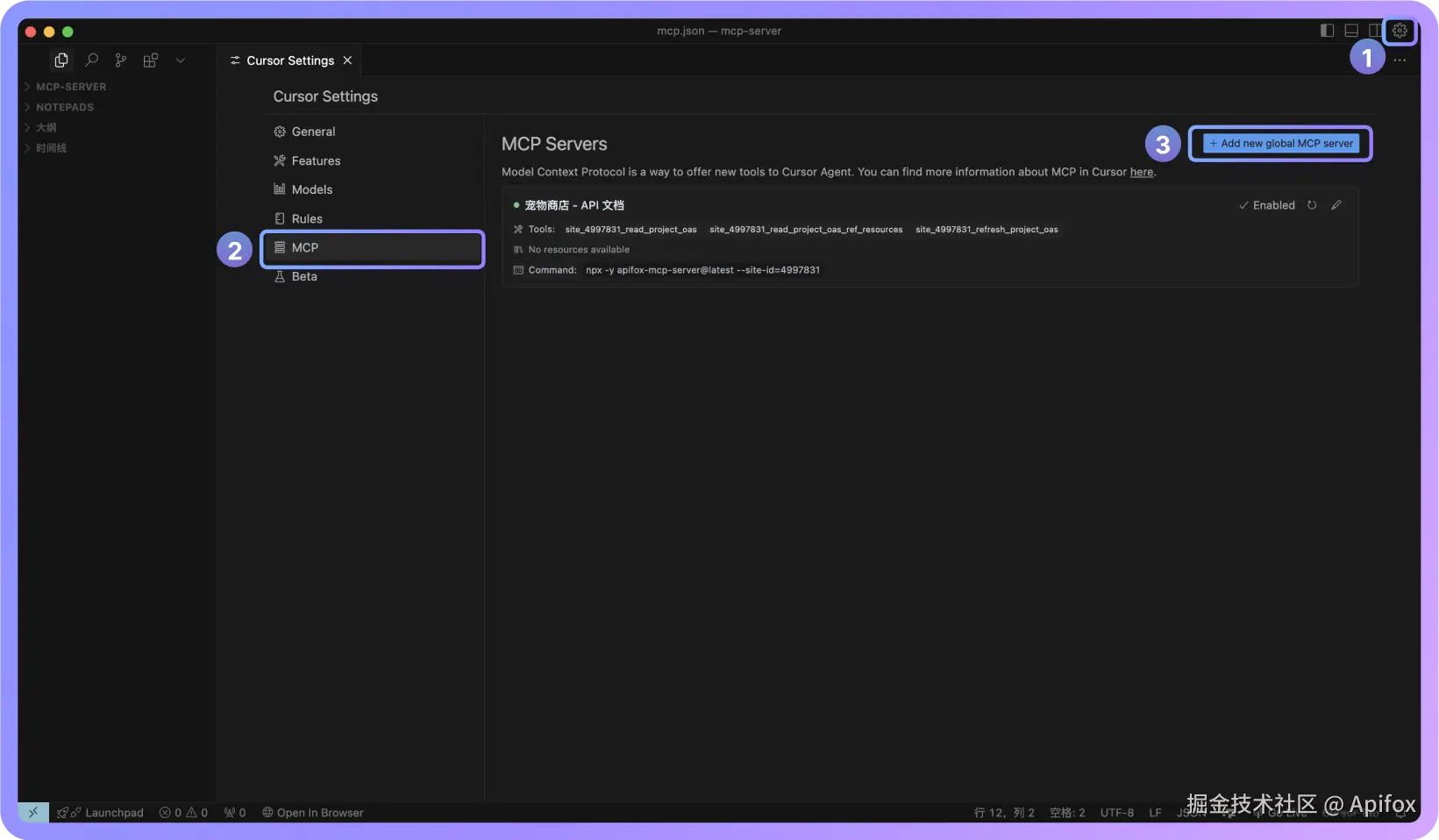 此外,你还可以为不同项目单独配置 MCP,方法是在项目根目录下创建 .cursor 文件夹,并在其中创建包含上述配置的 mcp.json 文件。