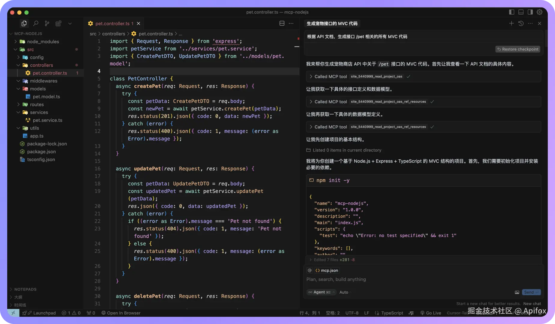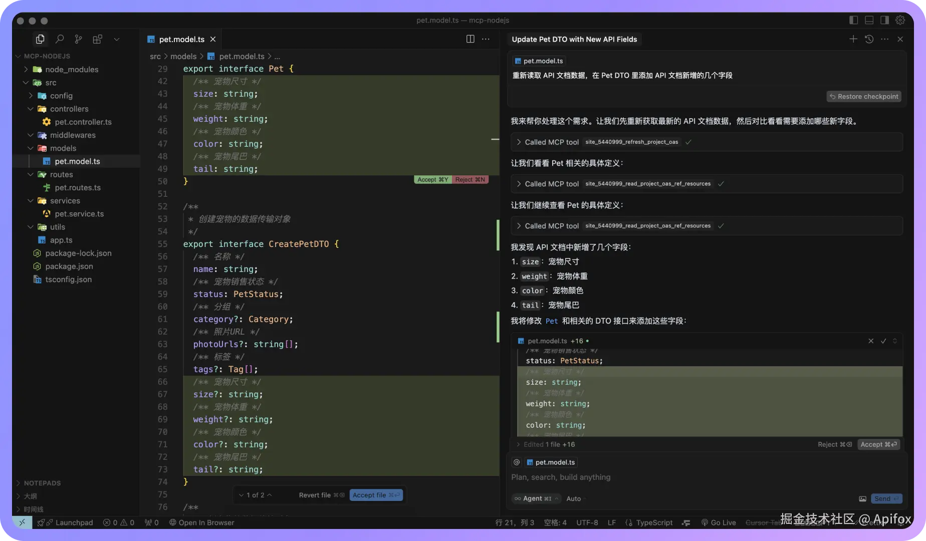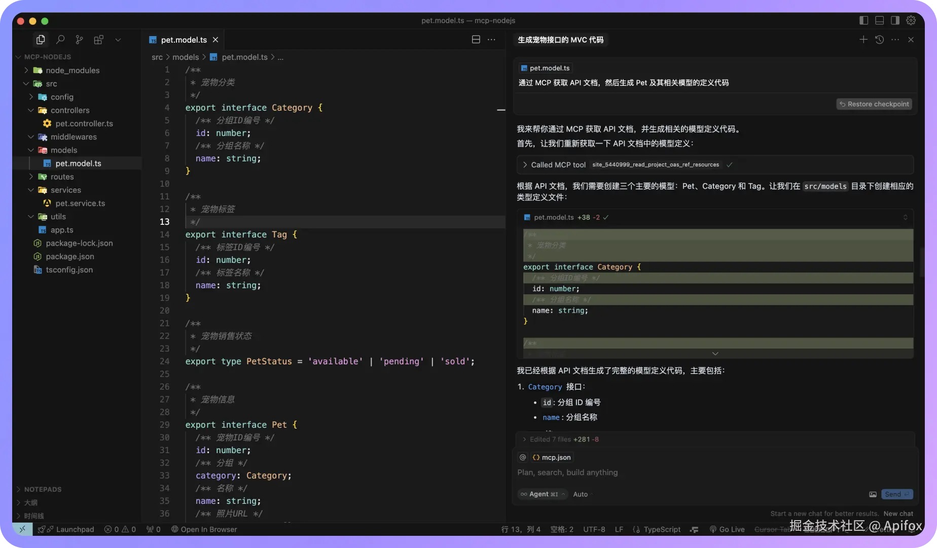 例如:通过 MCP 获取 API 文档,然后生成 Pet 及其相关模型的定义代码