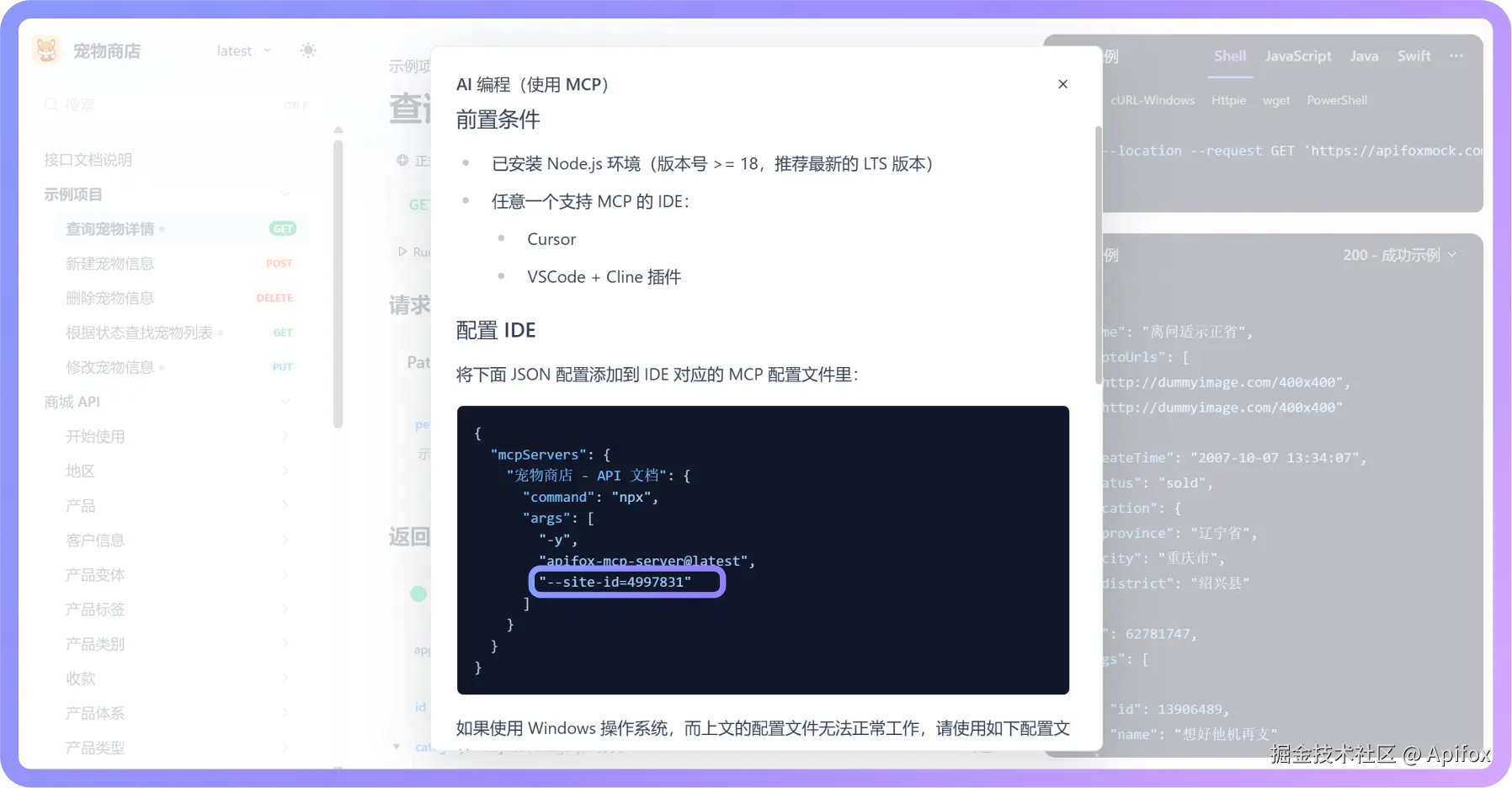 点击后,将弹出详细的使用说明和 MCP 配置文件,文件内已自动填充当前文档的 site-id。只需复制该配置,便可用于 IDE 中接入 MCP 服务。
