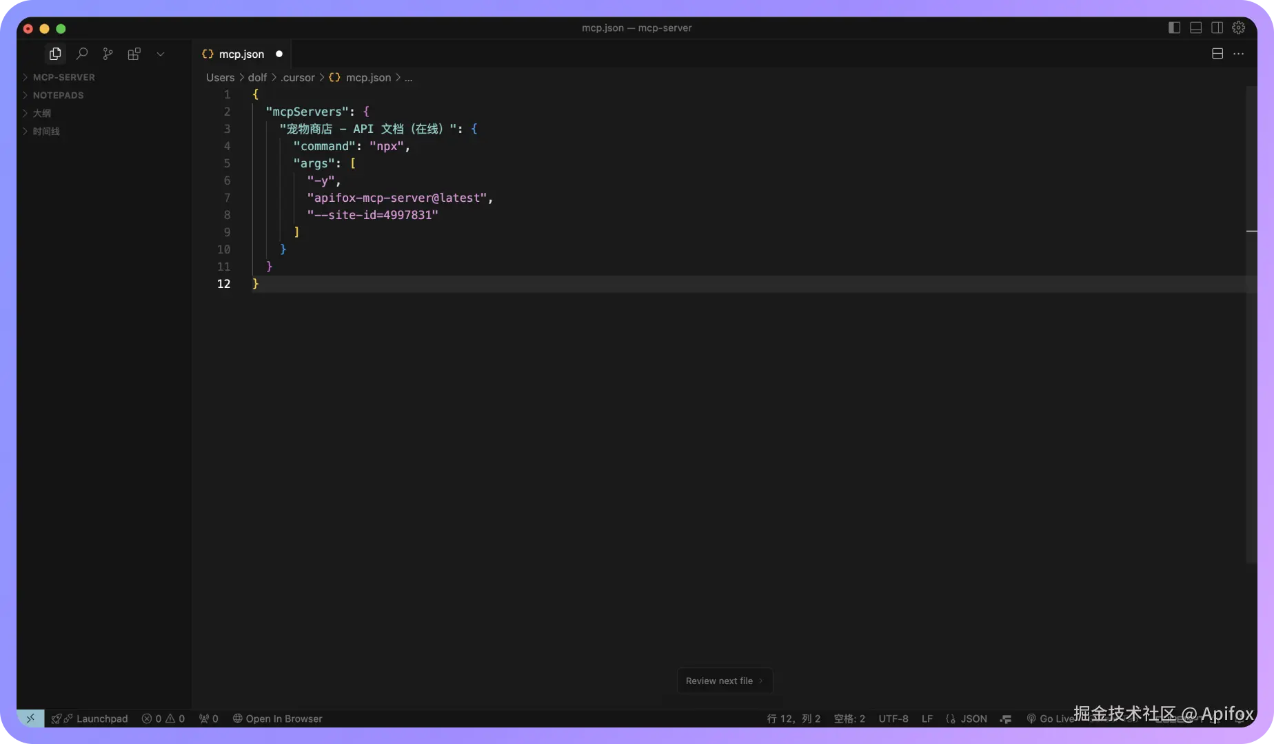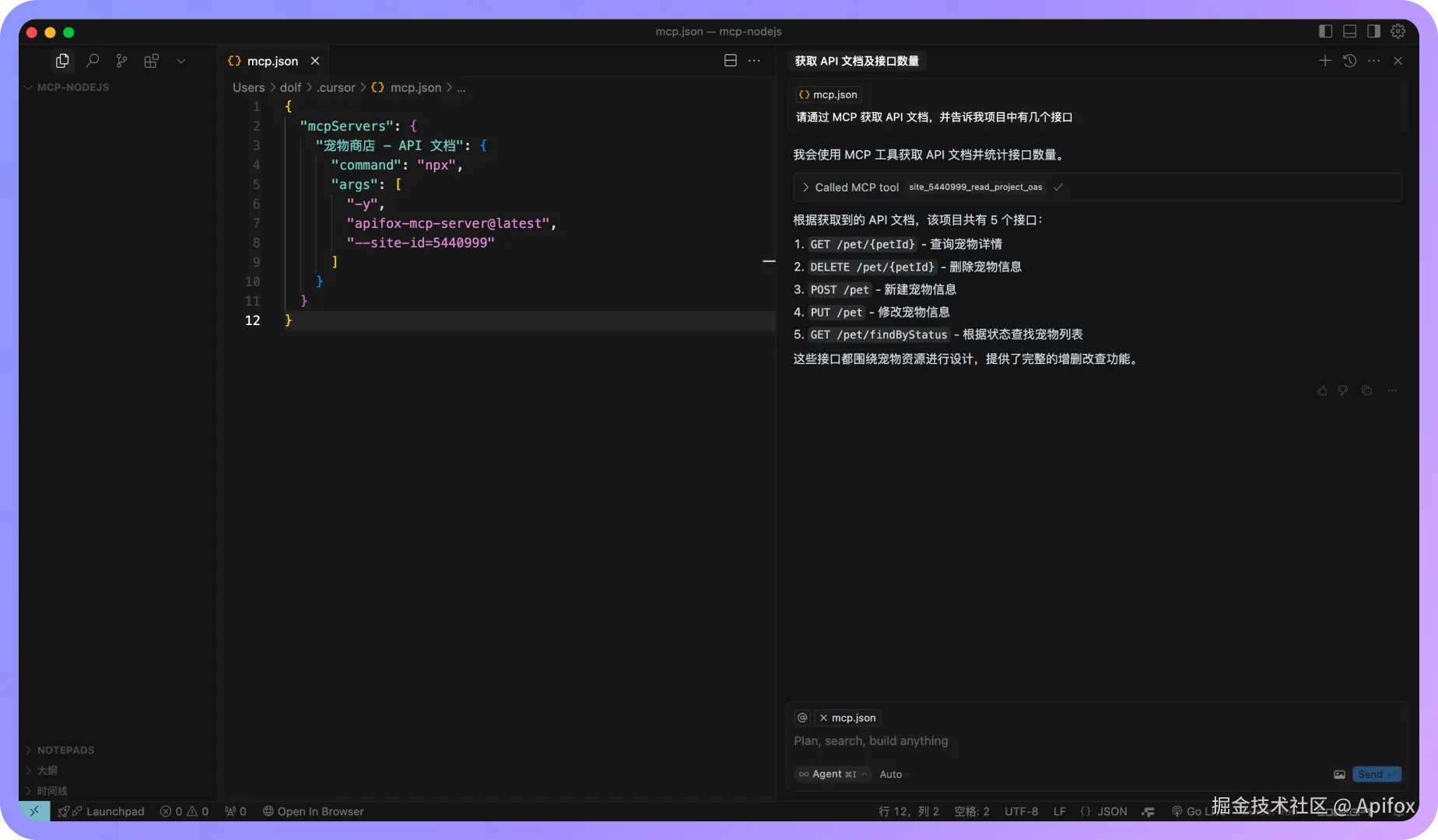 - 已从 Apifox 在线文档复制了 MCP 的 JSON 配置