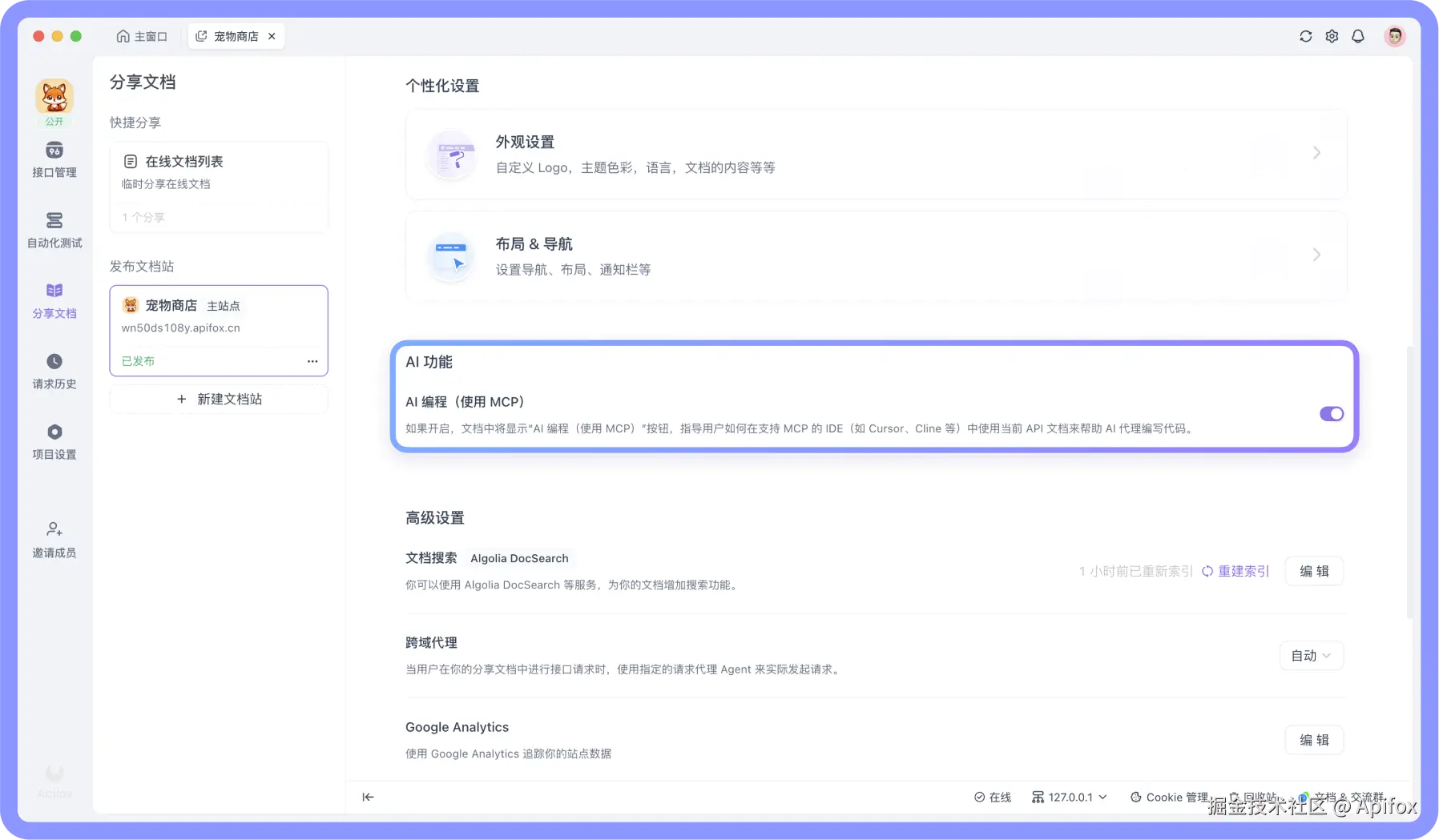 进入 Apifox 项目,依次点击「分享文档 -> 发布文档站 -> AI 功能」,开启 MCP 服务。