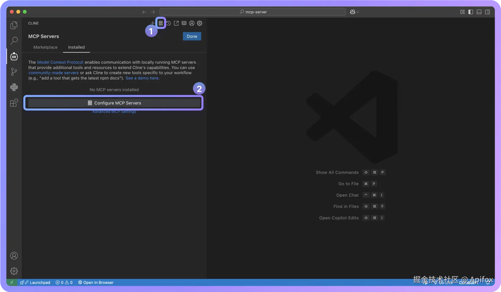 在 VSCode 中安装 Cline 插件,打开 Cline 面板,点击 「MCP Servers > Configure MCP Servers」。
