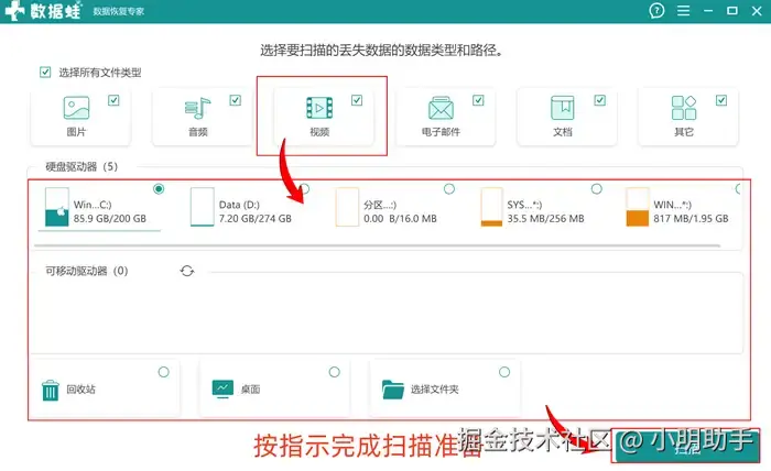 步骤1:在电脑中启用数据 蛙恢复专家,在软件的准备扫描版面中按指示选择需要扫描的文件类型(可以直接勾选“视频”),再勾选丢失视频的位置,点击“扫描”;
