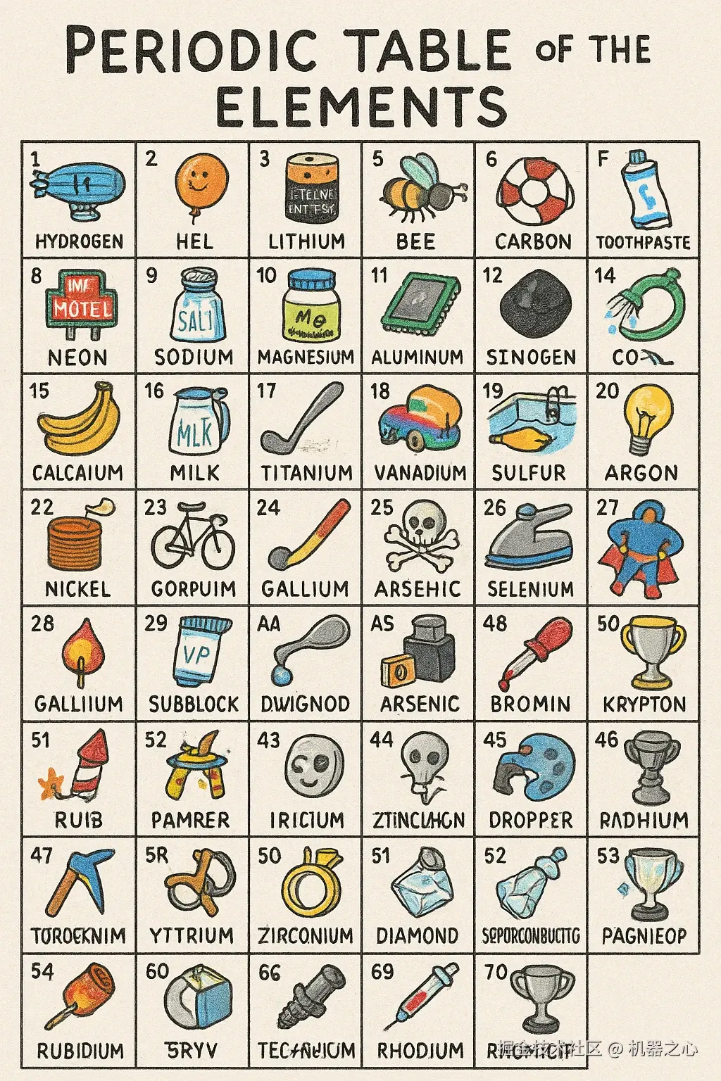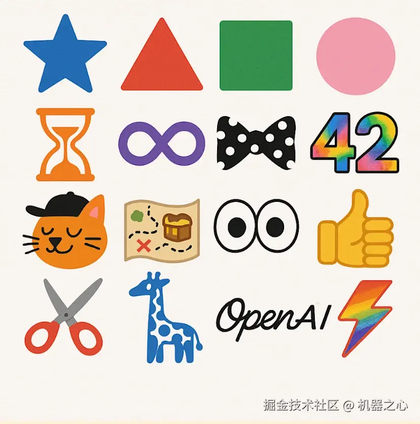 提示:「一张正方形图片,包含一个 4 行 4 列的网格,共有 16 个物体,背景为白色。从左到右、从上到下依次排列如下: