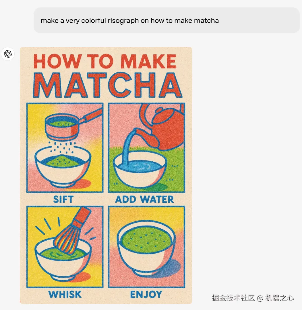 要求 4o 制作一幅关于如何制作抹茶的彩色图解,也没有问题。