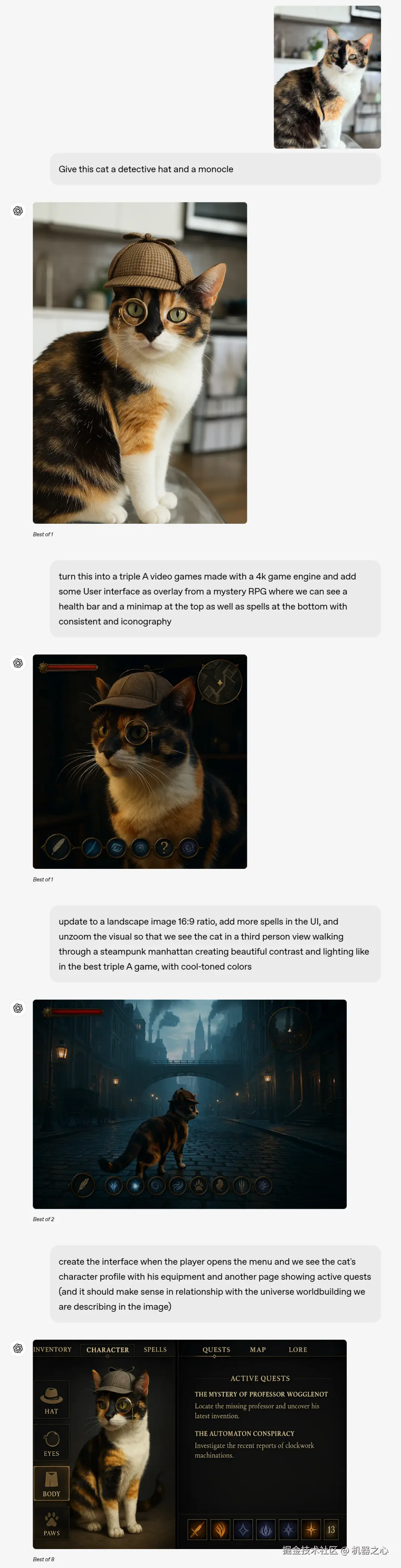 你还可以继续修改图片,只要给点提示就可以了,例如给定提示「将这个场景制作成一款 AAA 级的 4K 游戏引擎打造的视频游戏,并添加一个神秘角色扮演游戏的用户界面作为覆盖层。在游戏中,我们可以在顶部看到生命值条和小地图,底部则显示法术图标,整体界面风格保持一致且具有标志性。」对话过程一张精美的图片就生成了。