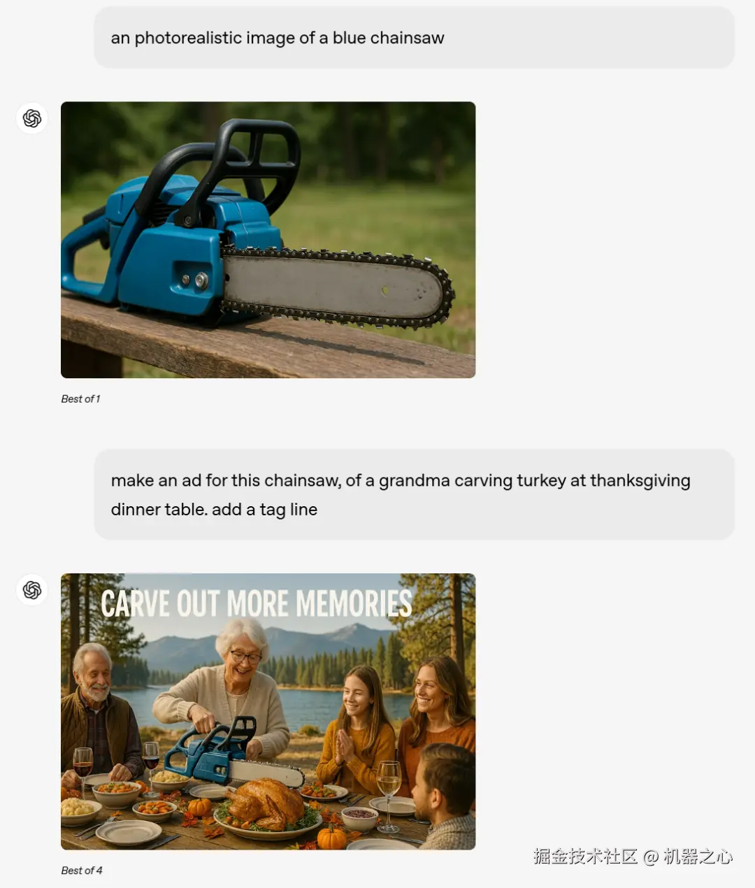 然后再给出提示:为这个电锯做个广告,一个奶奶在感恩节餐桌上切火鸡。并添加标签行。