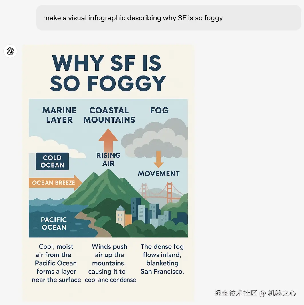 提示:制作一个视觉信息图表,描述为什么旧金山如此多雾。