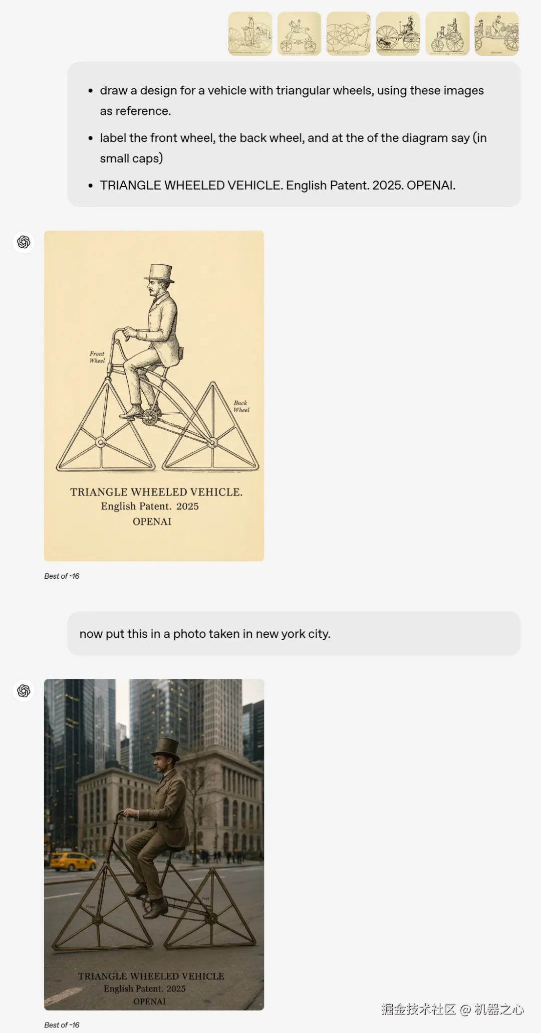 当你输入几张图像,然后给出提示:用这些图像作为参考,画一个三角形车轮的车辆设计。