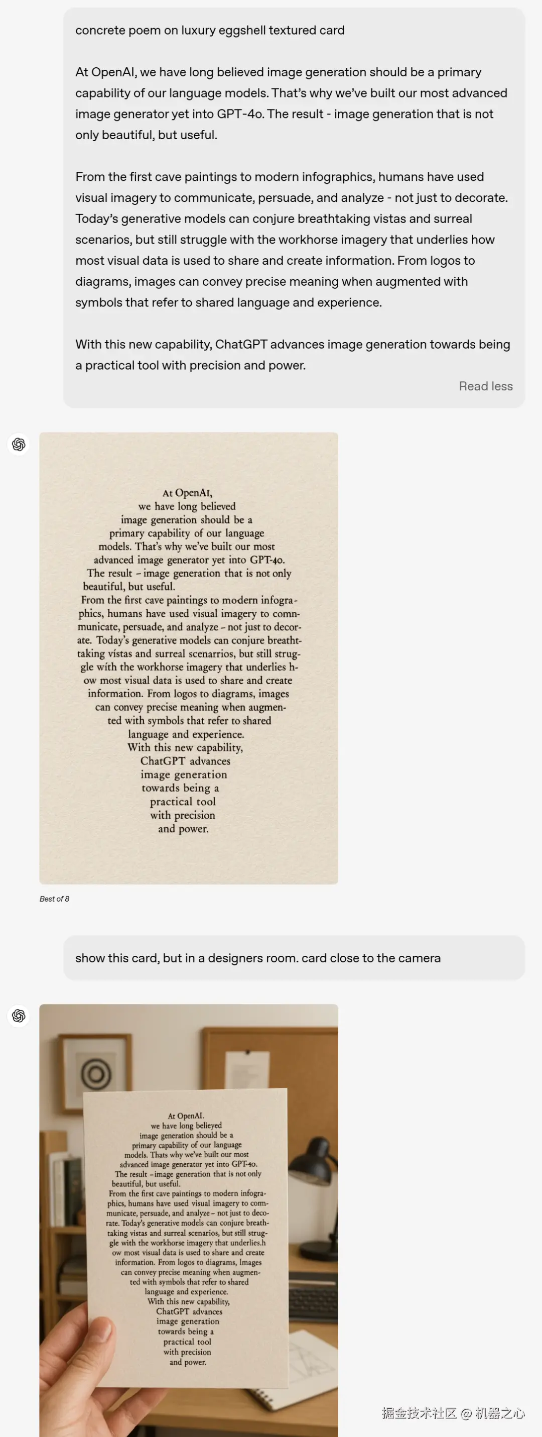 除了图像作为输入,你也可以从提示入手,例如要求 GPT-4o 生成一张「奢华蛋壳纹理卡片上的诗歌」,然后把诗歌内容也附加上,就能出现如下的效果图,你也可以进一步修改,输入提示就可以了。