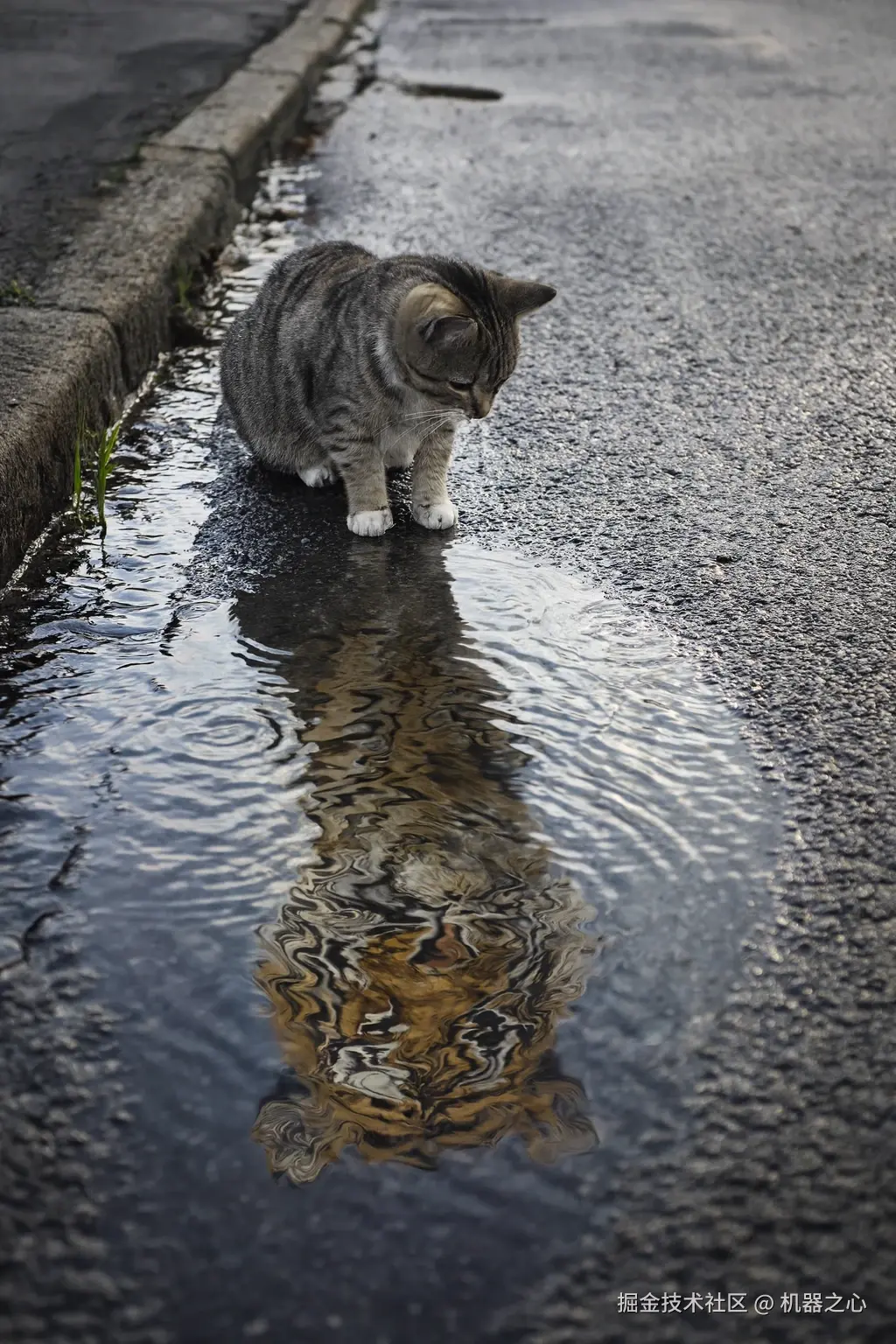 提示:一只猫望着街上的水坑,但它的倒影是一只老虎,而且两种倒影都被水中的涟漪真实地扭曲了。