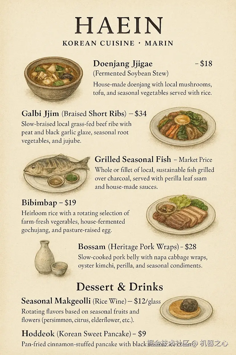 提示:「我在 Marin 开设了一家名为 Haein 的传统概念餐厅,主打采用有机农场新鲜食材烹制的韩式料理,并根据时令供应轮换菜单。请您设计一份菜单图片,需包含以下菜品 —— 整体风格要兼顾传统 / 乡村韵味与高端精致感。请为每道菜品配上优雅的彼得兔风格的插画,确保所有文字正确呈现,并使用白色背景。
