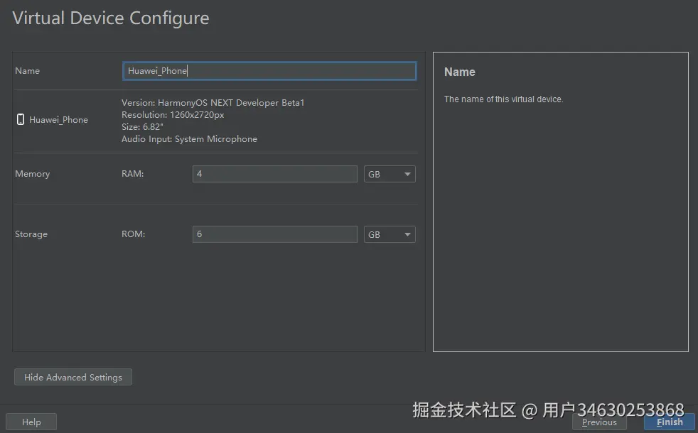 - 单击Next,核实确定需要创建的模拟器的名称,内存和存储空间,然后单击Finish创建模拟器。