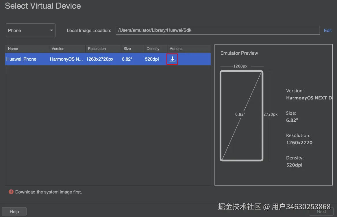下载模拟器镜像,您也可以在该界面更新或删除不同设备的模拟器镜像。单击Edit可以设置镜像文件的存储路径。Mac默认存储在~/Library/Huawei/Sdk下,Windows默认存储在C:\Users\xxx\AppData\Local\Huawei\Sdk下。