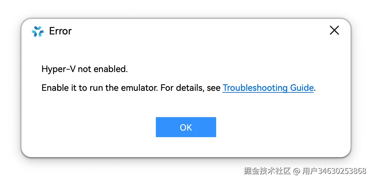 启动模拟器时,弹窗提示“未开启Hyper-V”或“Hyper-V not enabled”。